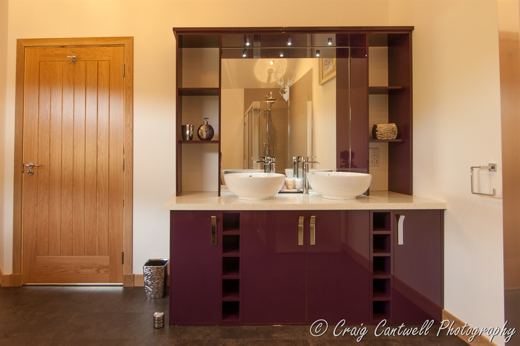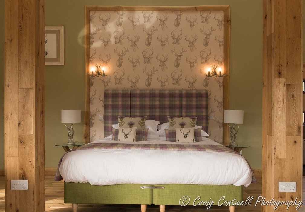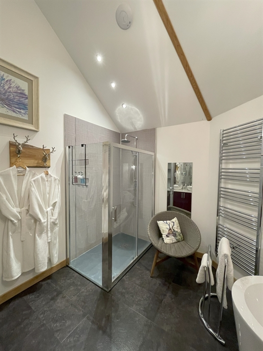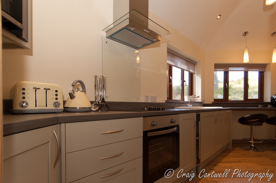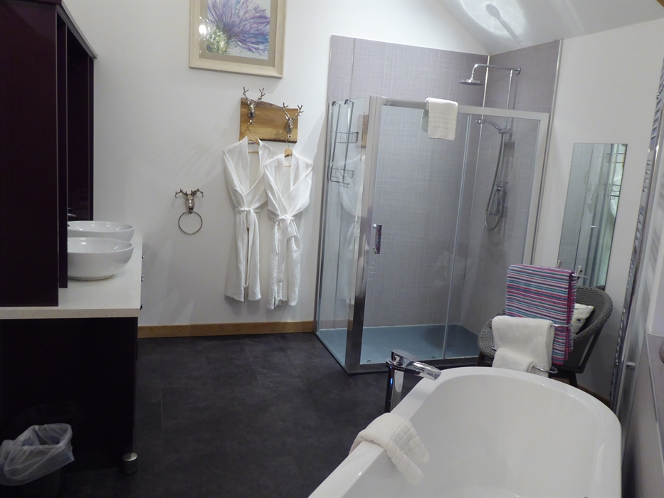 The luxury bathroom is designed for indulgence, featuring a freestanding double-ended bath positioned to offer uninterrupted hillside views, a spacious walk-in rainfall shower, and 'His & Hers' basins for added comfort. The separate kitchen is fully equipped with everything you need, including an oven and hob, fridge-freezer, separate wine fridge, coffee machine, microwave, dishwasher, washing machine, and a stylish breakfast bar for relaxed dining.