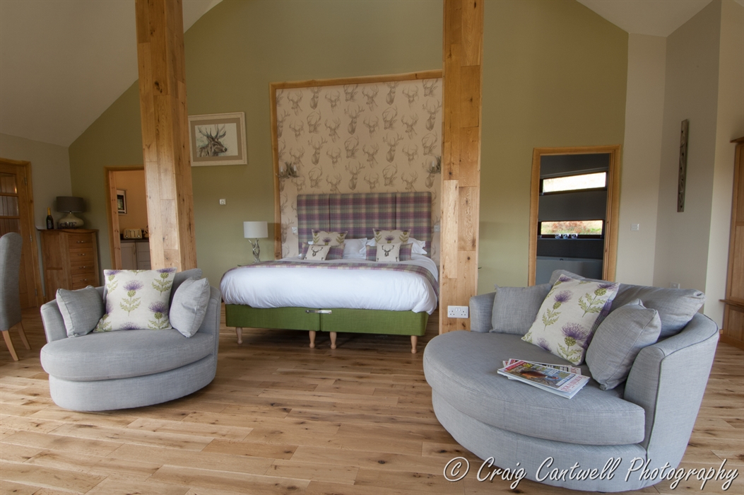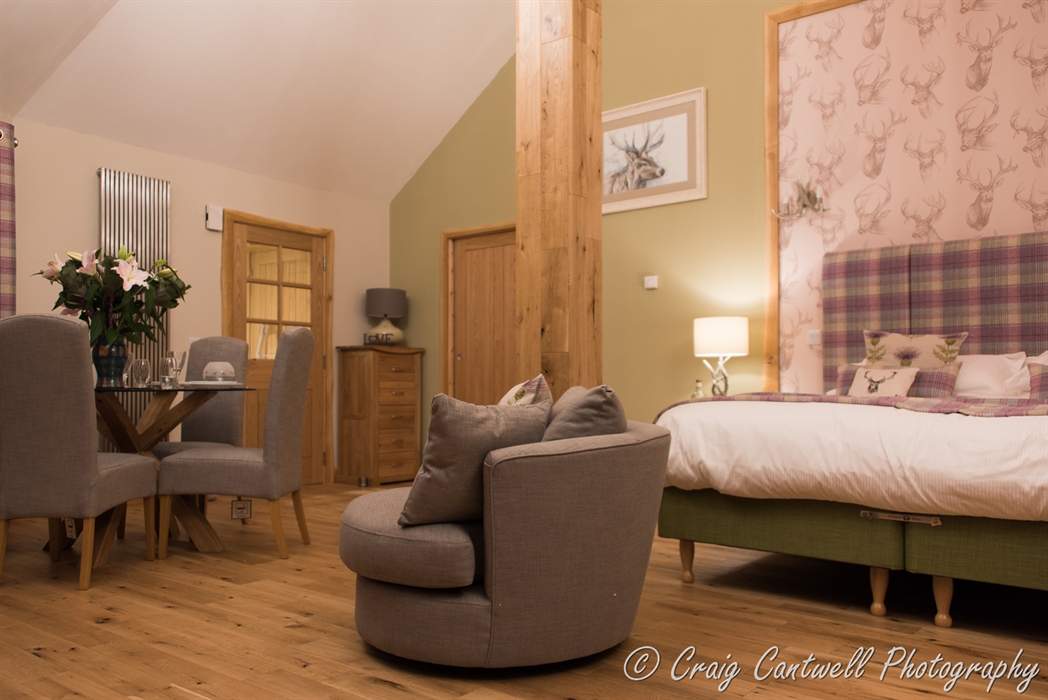 Step inside your private sanctuary, a beautifully designed open-plan space that blends elegance with comfort. At its heart is a super-king bed positioned beneath a vaulted ceiling and a glass pyramid skylight, allowing you to drift off under a canopy of stars. The lounge area is perfect for unwinding, with comfortable seating, Freesat TV, a DVD player, and complimentary Wi-Fi. A wood-burning stove, complete with a free supply of logs, creates a warm and inviting ambiance, ideal for cosy evenings in.