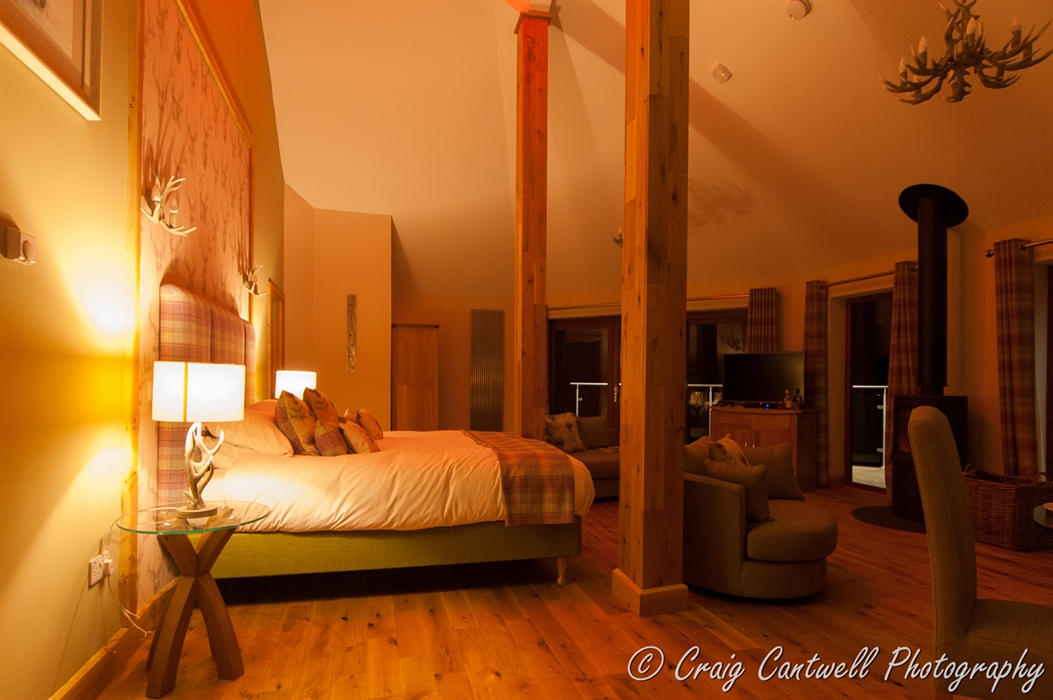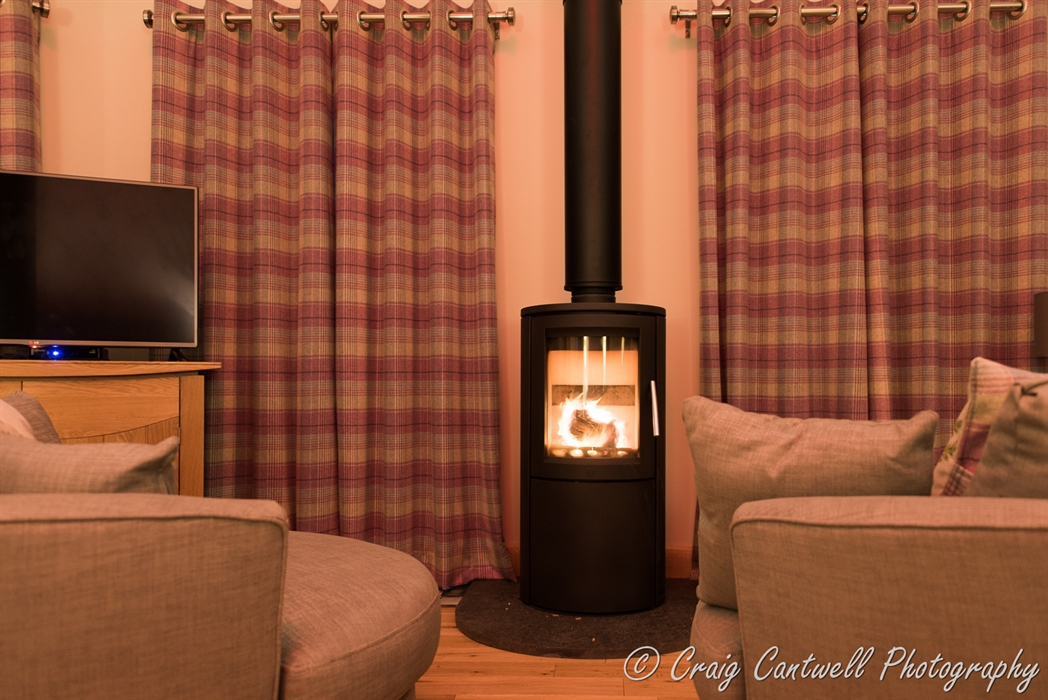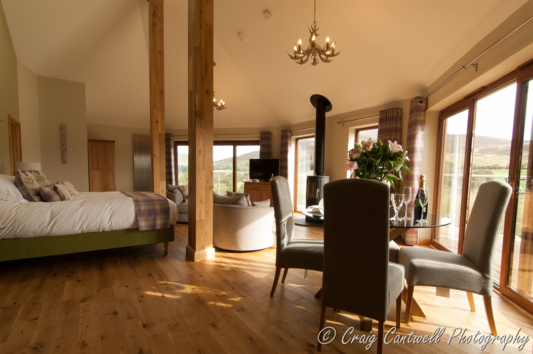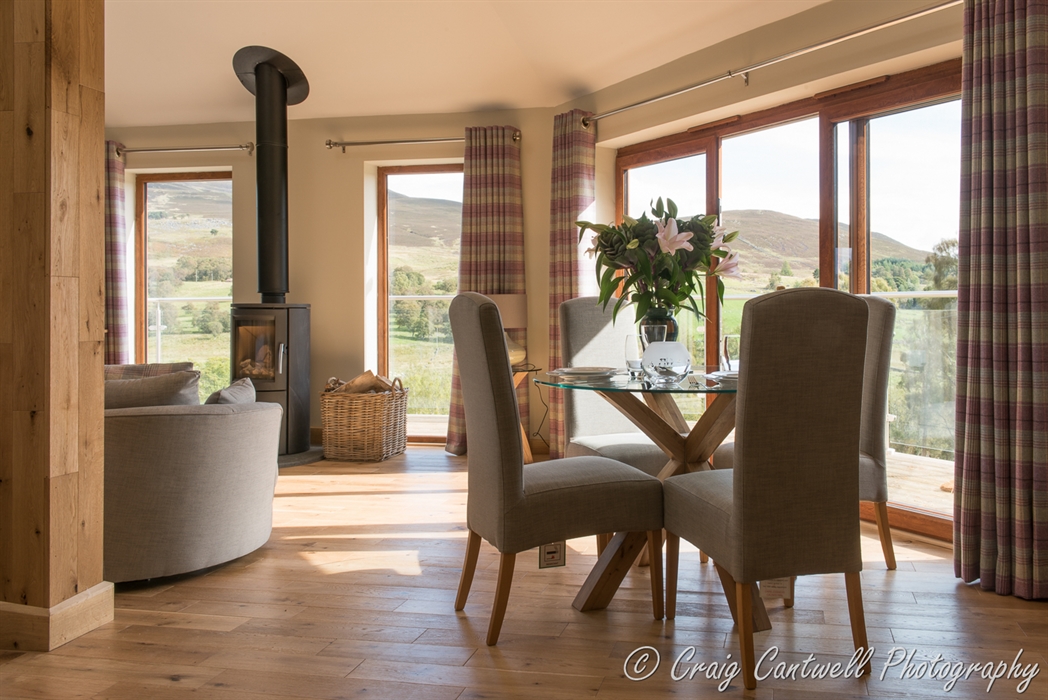 Floor-to-ceiling windows on three sides frame breathtaking views of the river and surrounding mountains, bringing the beauty of the Highlands right to your doorstep. Patio doors open onto a private wraparound deck that floats high above the hillside, where you can relax in your secluded hot tub, enjoy alfresco dining with the BBQ, or simply sit back and take in the spectacular views of the Cairngorm Mountains.