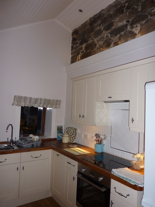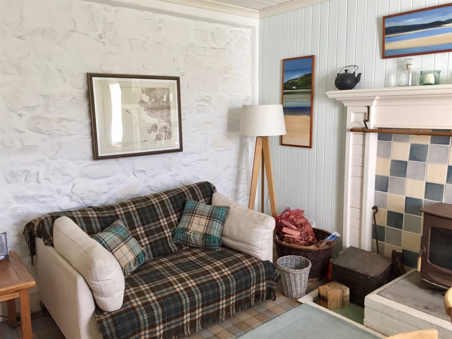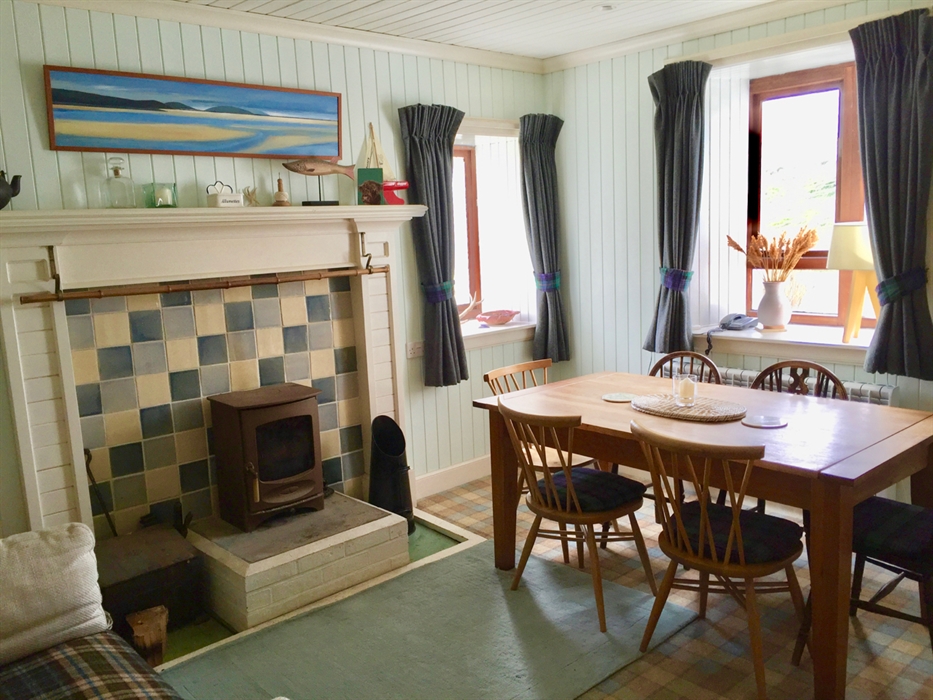 The house has a large stone built and glazed porch room leading into a hallway from which leads the stairs and doorways into the sitting room one way and dining room the other. There is a sumptuous plaid carpet laid throughout. The sitting room is decorated in colours to tie in with the sands and sea and has an open fire. The dining room has tartans and greens and is double aspect with Harris Tweed curtains with a multi-fuel stove. A door leads from here into the newly refurbished kitchen with all appliances including a substantial fridge freezer, large oven with ceramic hob and dishwasher. The kitchen is also double aspect and the rear window gives you views literally straight up Beinn Dhubh and over to Beinn Luskentyre, where golden eagles can be seen swooping over the summit.