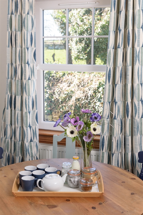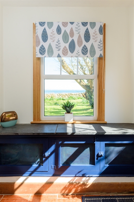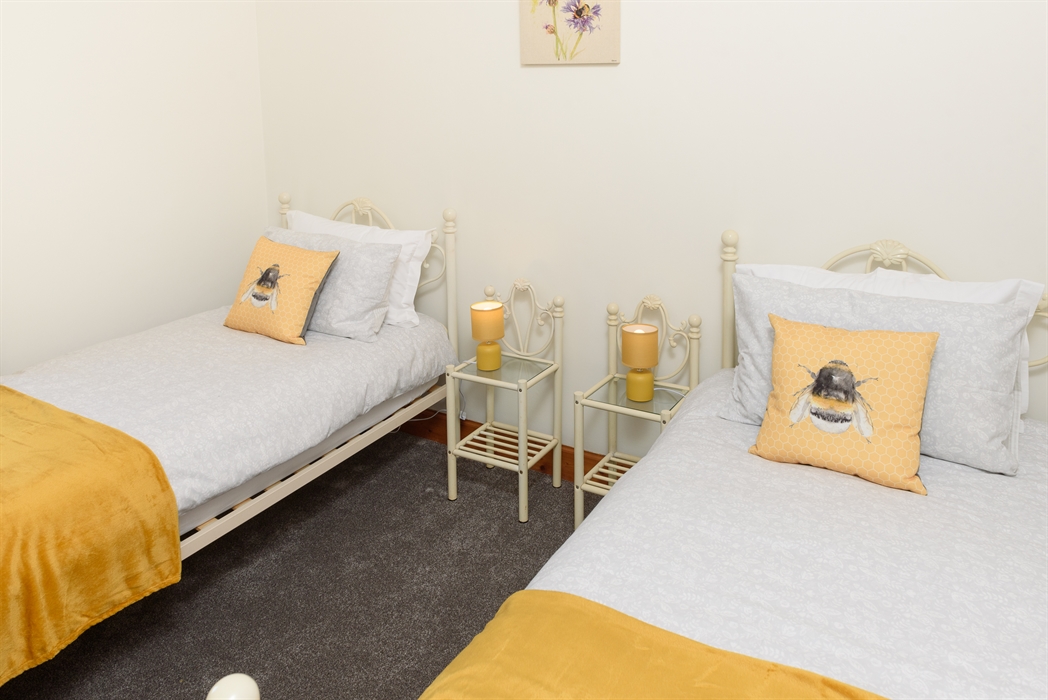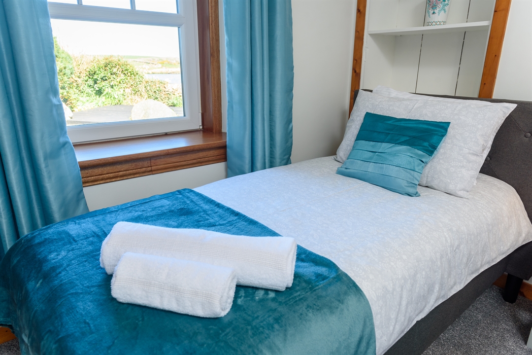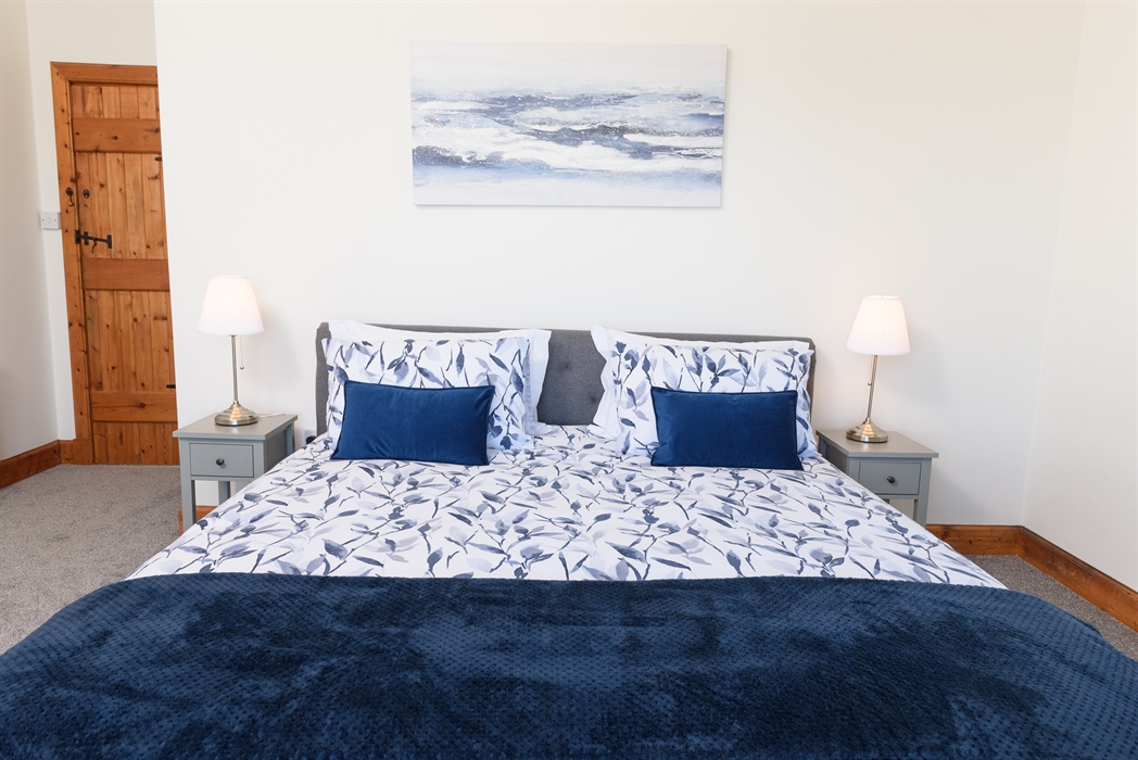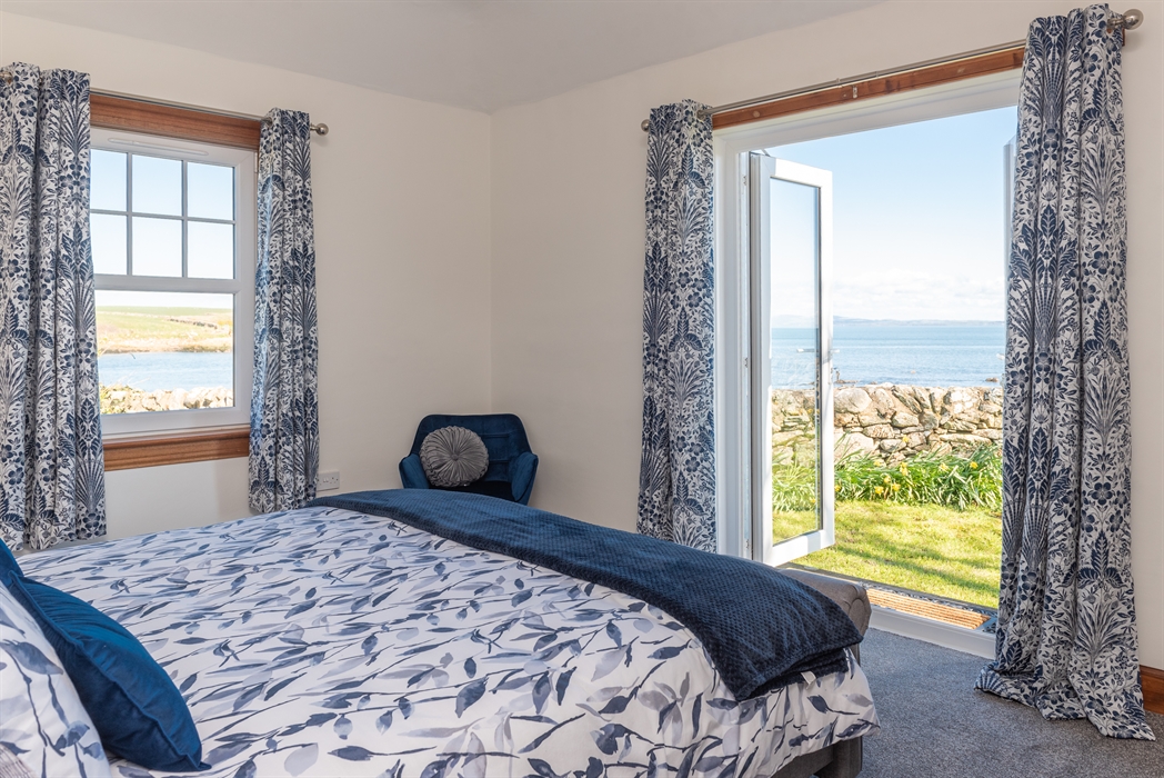 This charming, single-level former farm worker’s cottage comfortably accommodates up to six guests across three bedrooms: a master bedroom with a super king-size bed and patio doors opening directly onto the garden with bay views, and two additional bedrooms each furnished with twin single beds.