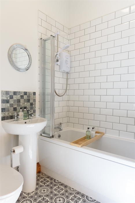 The well-equipped kitchen includes a breakfast area, electric cooker, fridge/freezer, dishwasher, and washing machine, ensuring all the comforts of home. The bathroom is fitted with a bath and shower over, heated towel rail, and toilet.