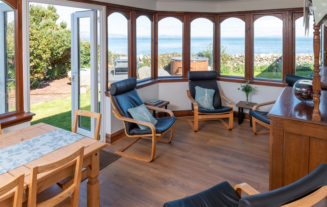 The inviting living room is equipped with a Smart TV and Smart Speaker, providing a cosy space for relaxation. Adjacent to the living room, the conservatory features panoramic windows and patio doors leading to the garden, offering breathtaking sea views and a dining area to enjoy meals against the backdrop of stunning sunsets.