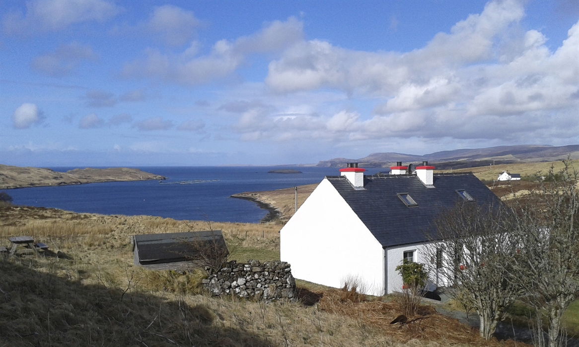 Situated by historical 'Dun Flashadder', the croft and cottage is only a few hundred metres off the main road, A850. It's a 2 min drive from Edinbane, 15 min from both Portree or Dunvegan and neighbour to well-known Waternish.