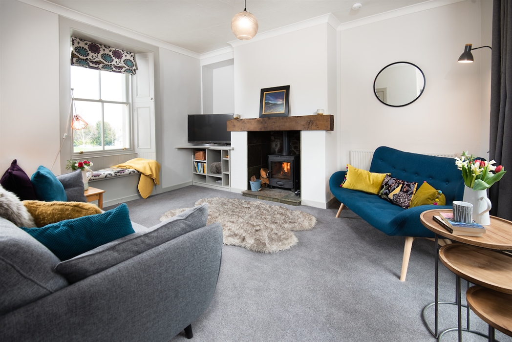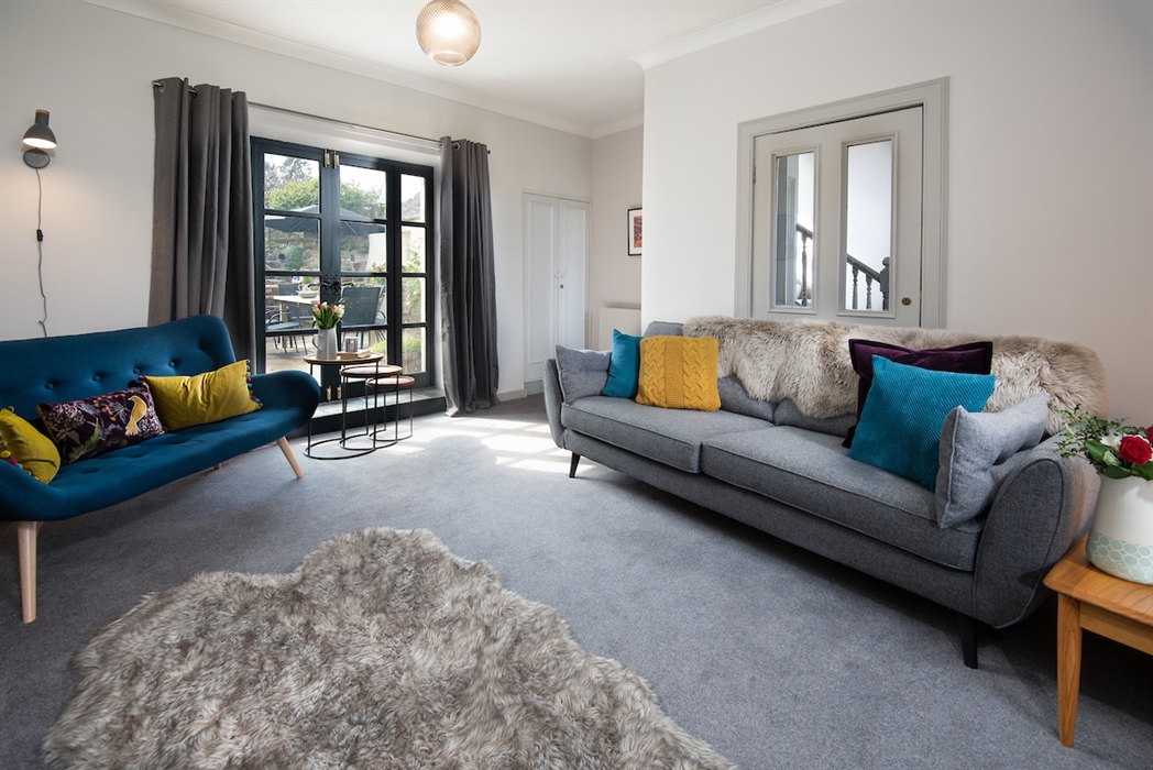Sitting room with one large sofa and one small sofa, wood burning stove with initial supply of logs. Smart TV (no DVD player). Double doors lead to a private patio and enclosed terraced garden.