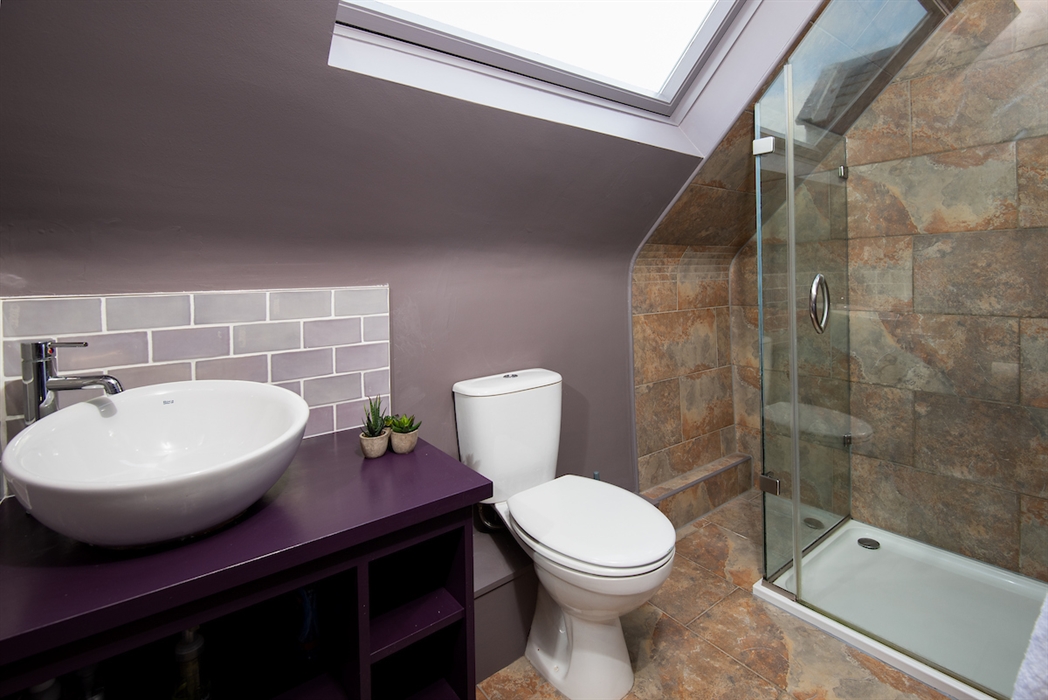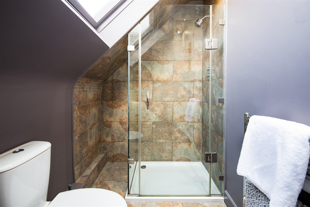 Bathroom with large shower, heated towel rail, basin and WC. Underfloor heating.