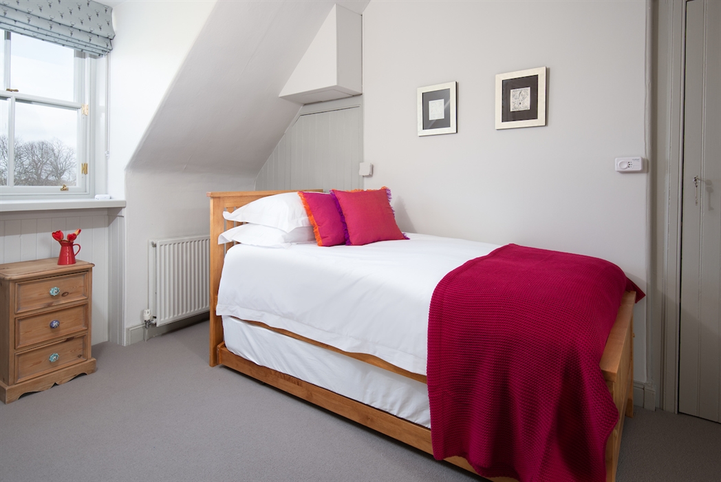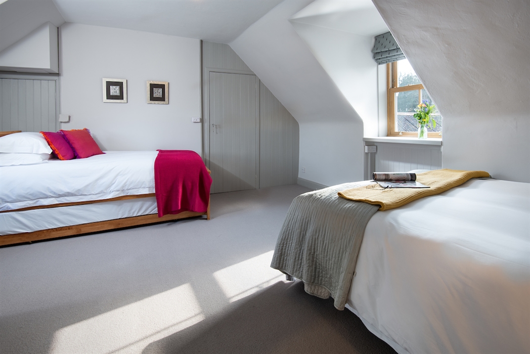 Bedroom one with 5’2” king size bed, single 3' bed and separate 3' truckle bed, side tables, large in-built wardrobe with hanging and storage space.