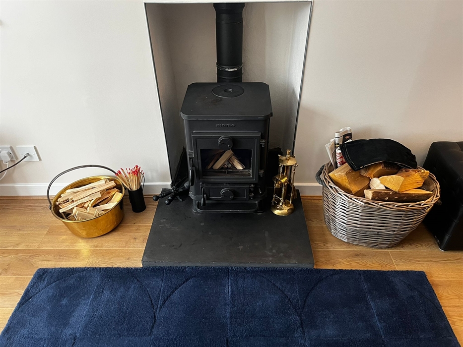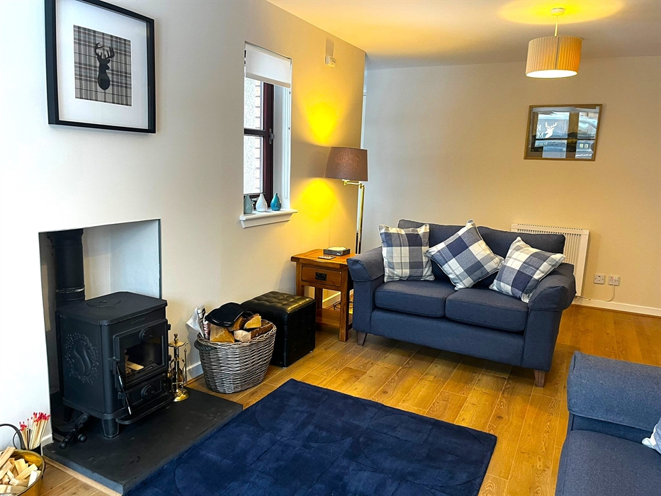 Step inside to find high-quality furnishings, luxurious beds, and soft, cosy sofas—perfect for curling up by the wood-burning stove after a day of exploring. The wood flooring adds warmth and elegance, while large windows flood the space with natural light, creating an airy and inviting atmosphere.