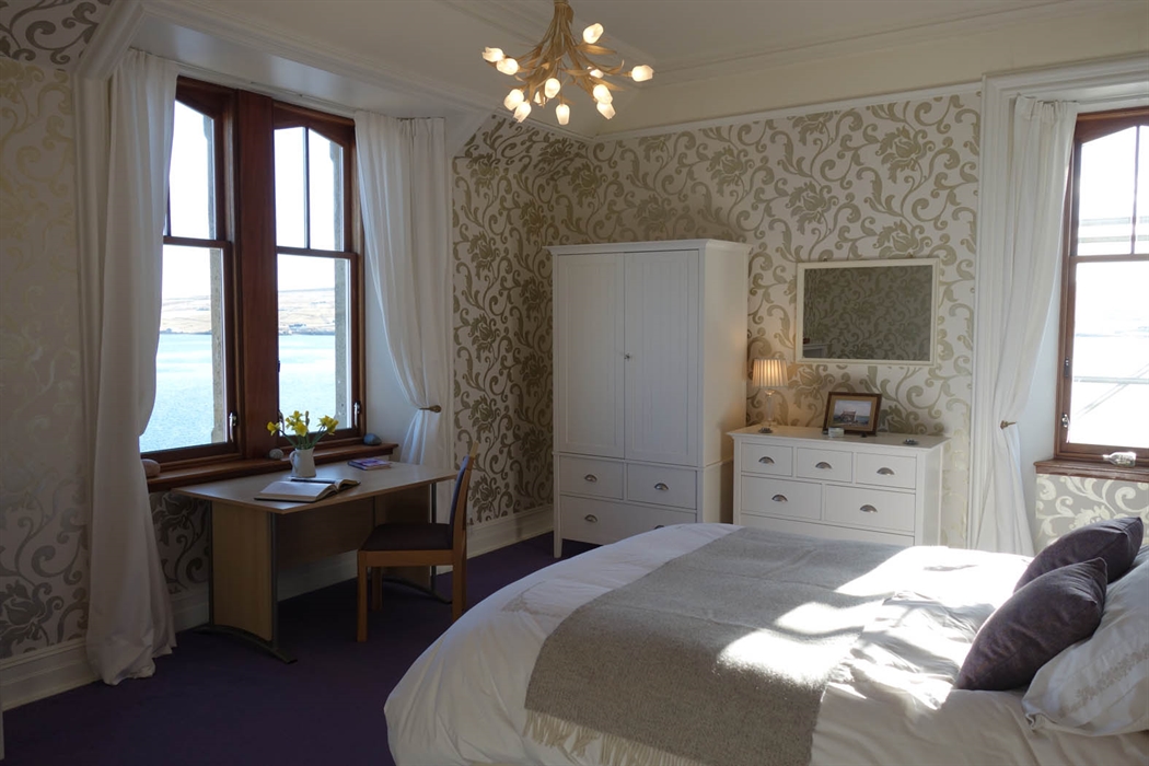 South Ness House is a spacious 100 year old home in historic Lerwick with panoramic sea views . The accommodation includes a large double bedroom with double aspect sea views, a bathroom and use of an elegant breakfast room over looking the sea. There is a separate area to dry outdoor clothing.