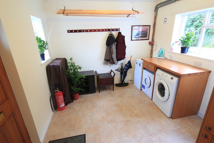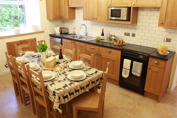 The large and spacious kitchen is modern and very elegant with wood fronted units and dark wokr surfaces. In the middle of the room is the lovely dining table, which can comfortably seat up to eight for family meals or special occasions. Catering can also be arranged prior to your arrival if required for a celebratory meal. The kitchen is very well equipped with everything you will need for cooking meals in the Scottish Highlands, including a fridge/freezer, microwave, dishwasher, electric twin oven and four ring ceramic hob. There is also plenty of storage space for a weekly shop saving you the trip to the local shop in Glencarron.