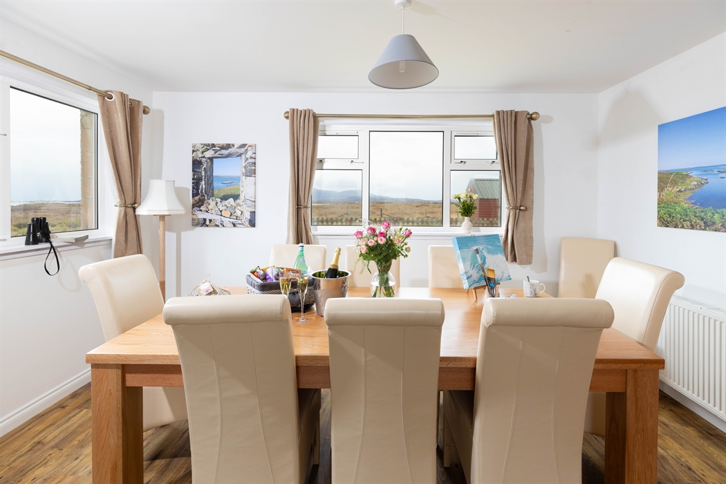 The interiors here are welcoming and cosy, making Stella Maris an ideal getaway throughout the year. The ground floor living space is designed to make the most of the views with a large kitchen/diner and comfortable sitting room. One bedroom is on the ground floor and the remaining three bedrooms are on the first floor. Please note, whilst there are enough bedrooms for eight guests, this is for flexibility and the property accommodates six plus a baby. During cooler weather enjoy the scenic views from sitting room warmed by the peat fire and in summer time the gardens offer an ideal place to sit, take in the views and enjoy a barbecue.