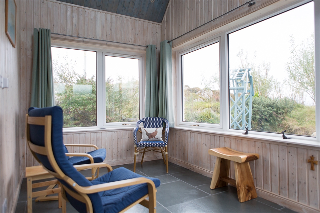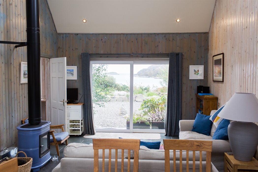 The large open plan kitchen diner and living room has unhindered views South and North, high double height ceiling and a beautiful wood and peat burning stove for cooler evenings or to lend atmosphere. The sun lounge, which leads off the double bedroom, is also South facing with windows looking onto the secluded landscaped garden and the sea beyond. There is also a workroom with sea view which is ideal for painting or writing.