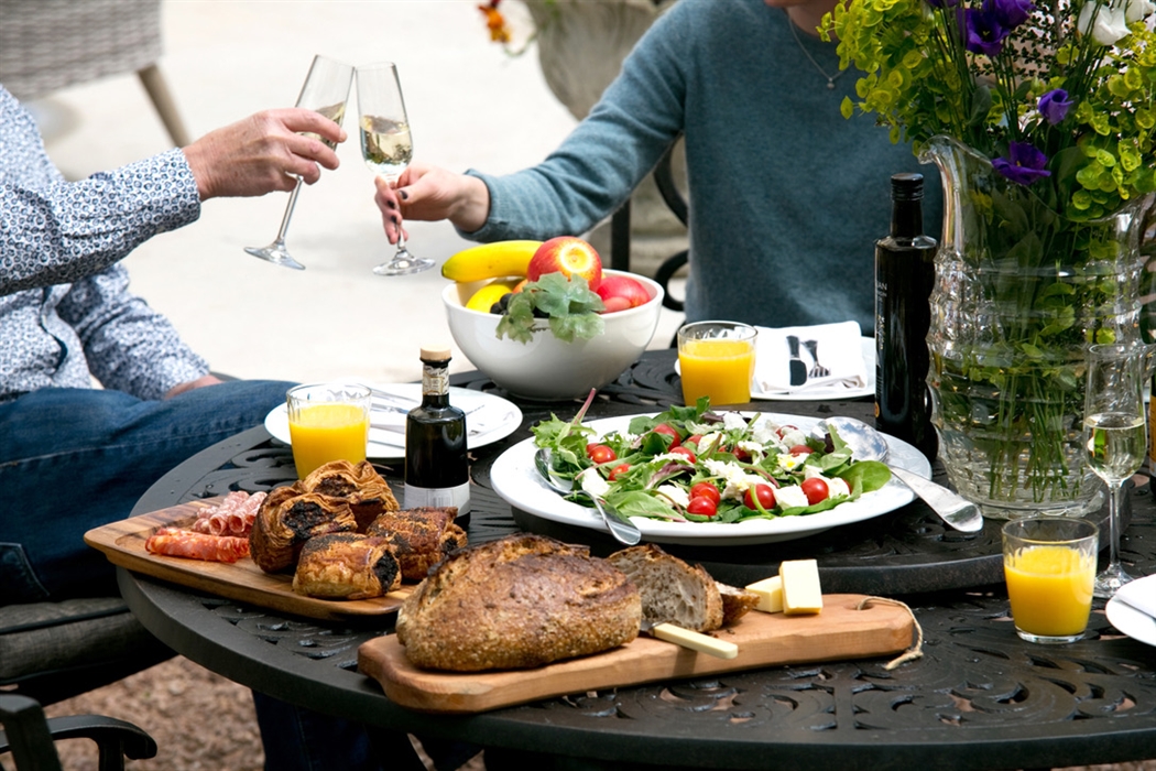 Breakfast bar table and chairs also situated in the kitchen area which provides a great social space. From the kitchen there is access to an outdoor dining space with a small bistro table which attracts the evening sun.
