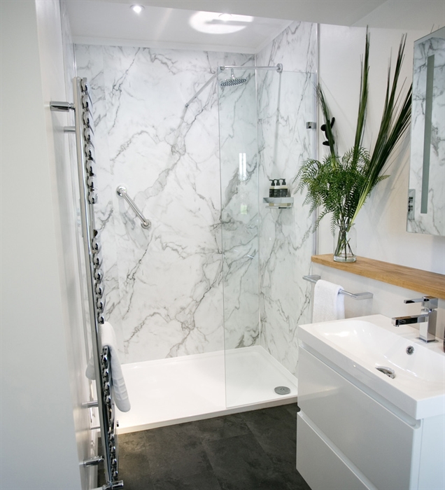 The shower room is situated just off the kitchen with a lavish walk-in shower with large water fall shower head. The bathroom is also kitted out with underfloor heating, wash hand basin and WC.