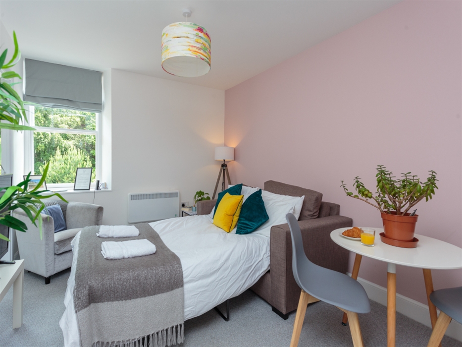 Walk into the bedroom and feel your troubles melt away. This well-appointed room has everything you could need. The spacious double bed – fitted with an eye-catching statement headboard -faces an inspiring view over the River Leithen.