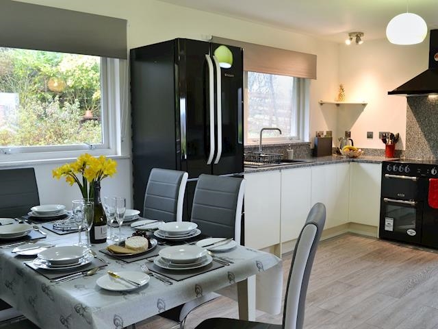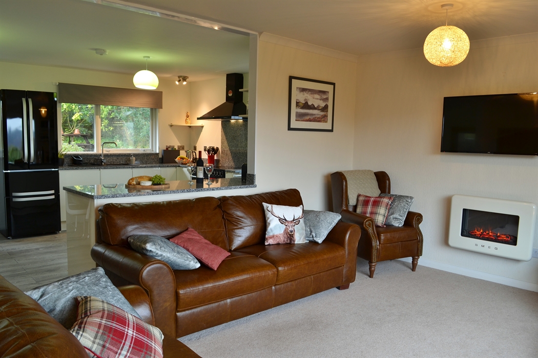 Enjoy leisurely breakfasts and lively gatherings around the kitchen table whilst soaking up sweeping views to Ben Cruachan mountain. Summit Cottage has a high quality, well-appointed kitchen/diner with everything you will need and more. It is a wonderful sociable space that flows into the bright living room. Spend cosy evenings on the large leather sofas adorned with soft woolen and tweed furnishings, in the glow and warmth of the stylish wall fire and atmospheric lighting. Entertainment for all ages is here with Smart TV (with Freeview and DVD player), wide range of board games, children’s toys and an extensive book and DVD collection.