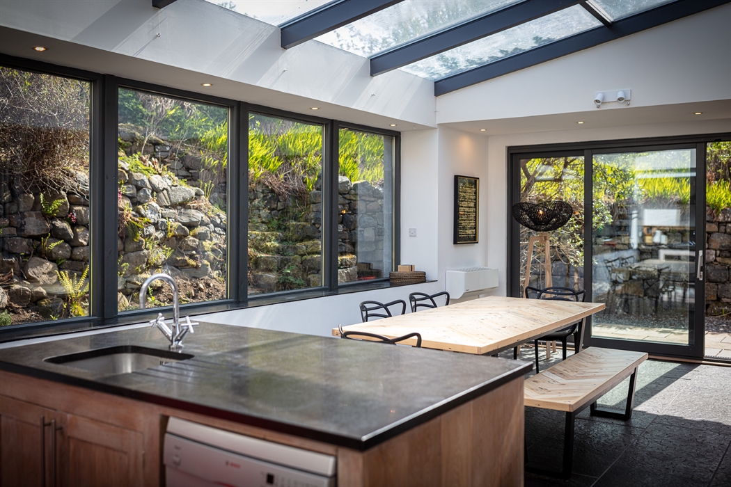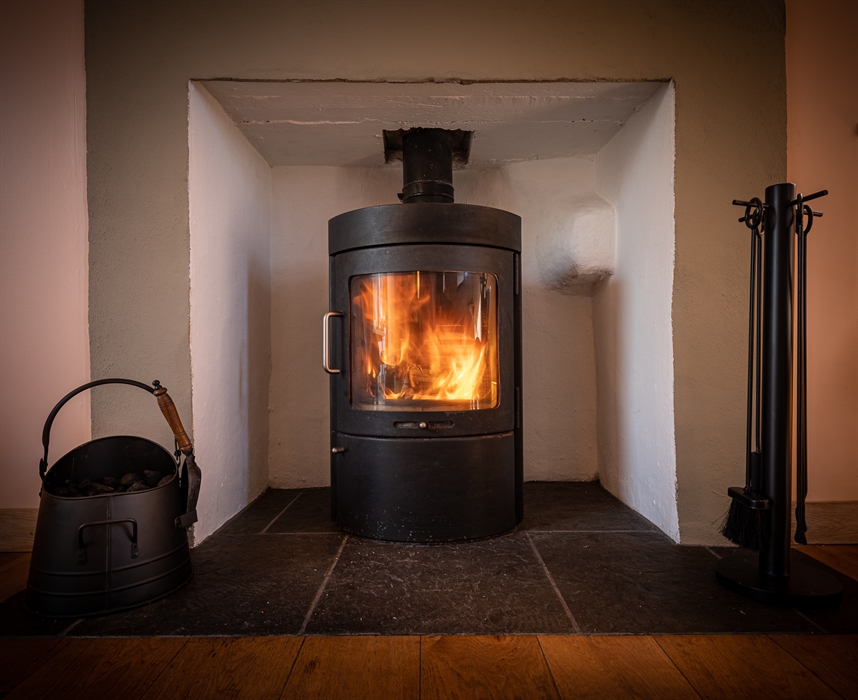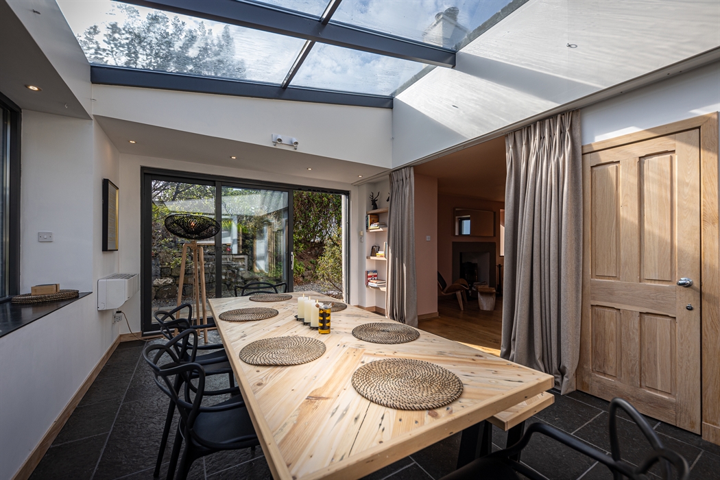 The open-plan living space is the heart of the house. A wood-burning stove invites cosy evenings together, while the kitchen — with its cherry-red Rangemaster oven, sleek granite worktops, and well-stocked cupboards — is made for sharing good food and laughter.