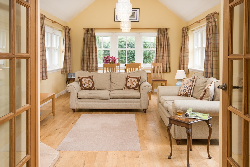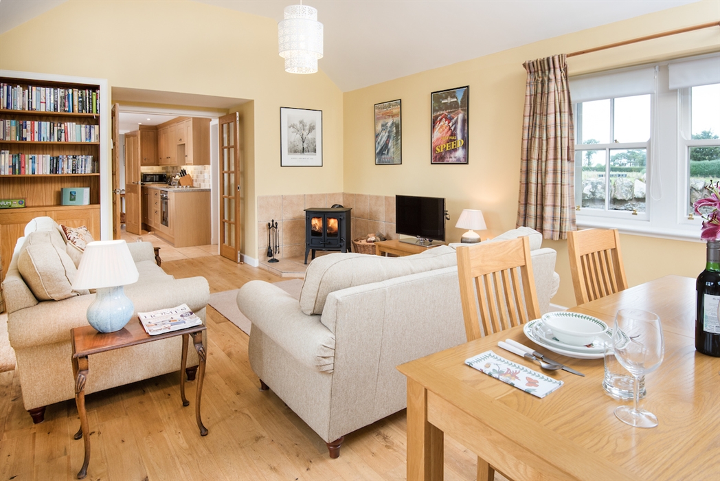 Spacious sitting / dining room with French doors to the garden. Cosy seating area with log burner with logs provided, two double sofas, TV with Freeview and DVD player, iDock, books and games. Dining table for 6 guests.