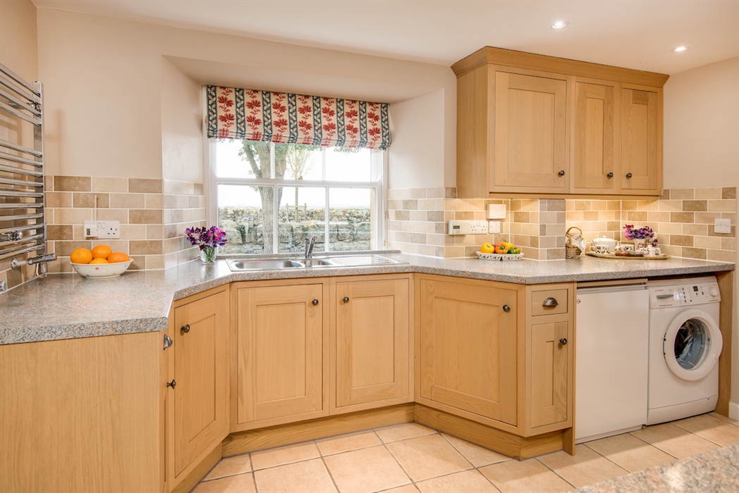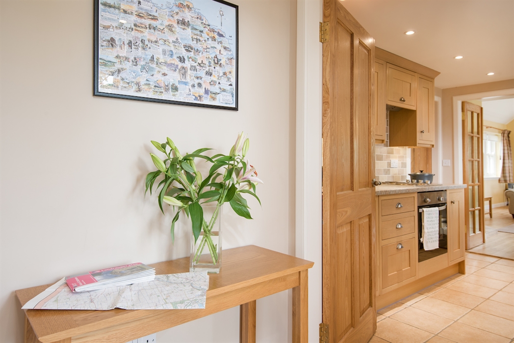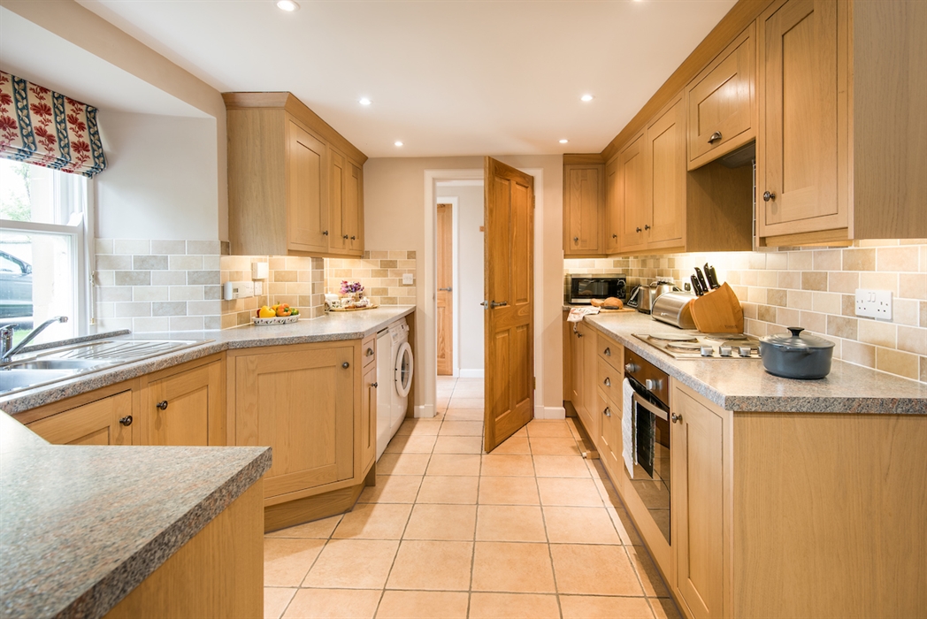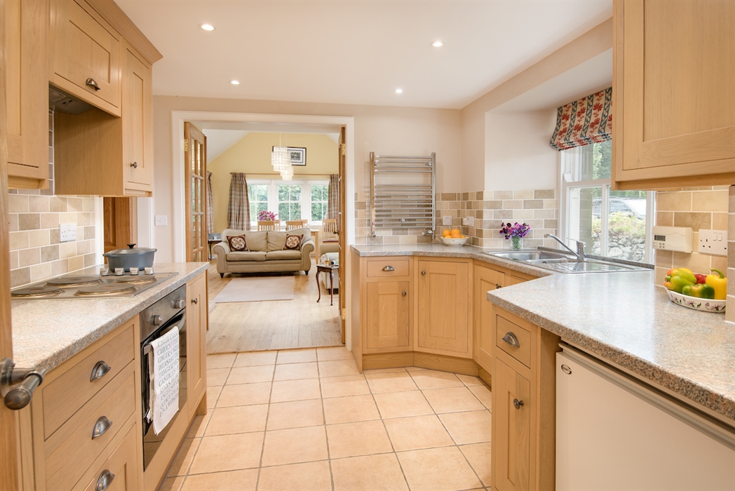 Well equipped kitchen with oven and 4 ring hob, microwave, fridge with ice compartment, washing machine and small television. Please note there is no dishwasher. Glazed doors lead to the open-plan living area.