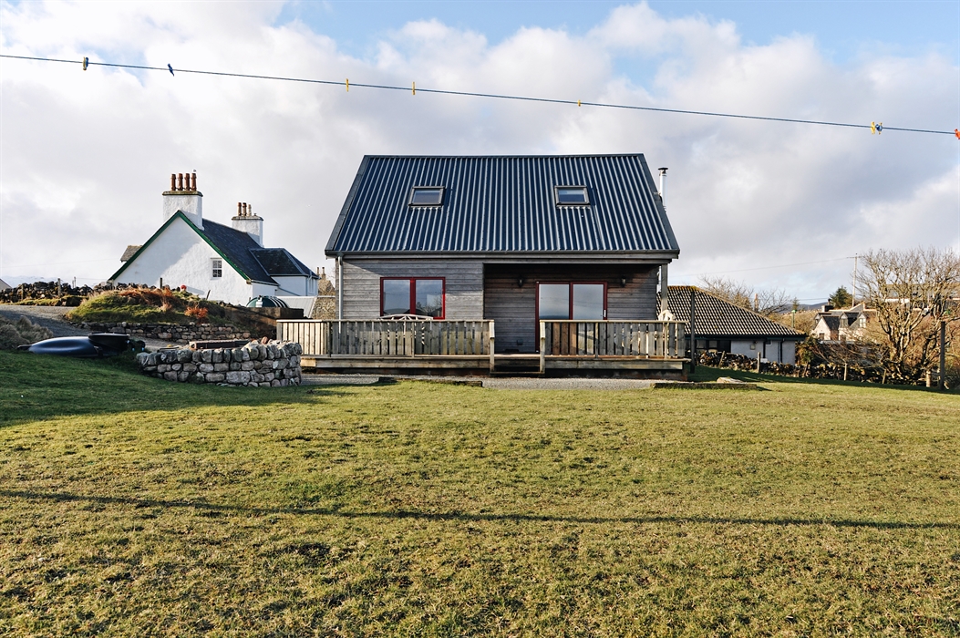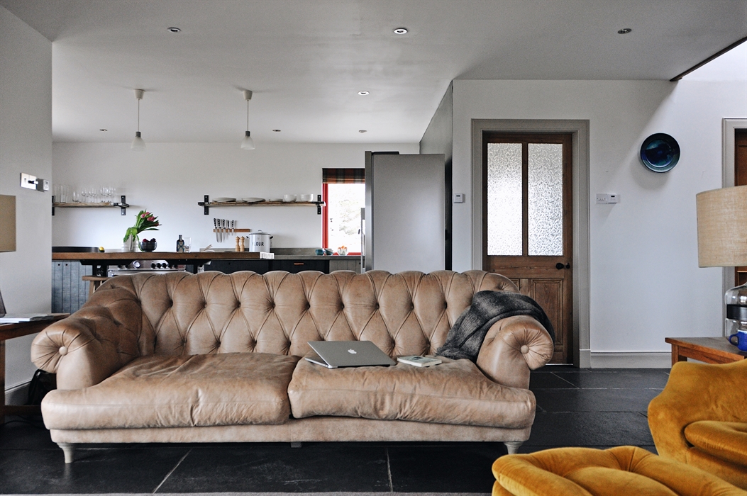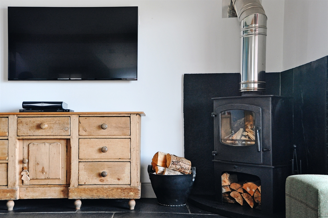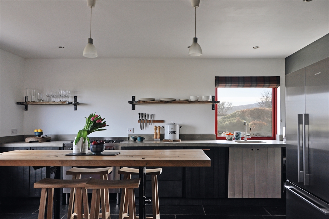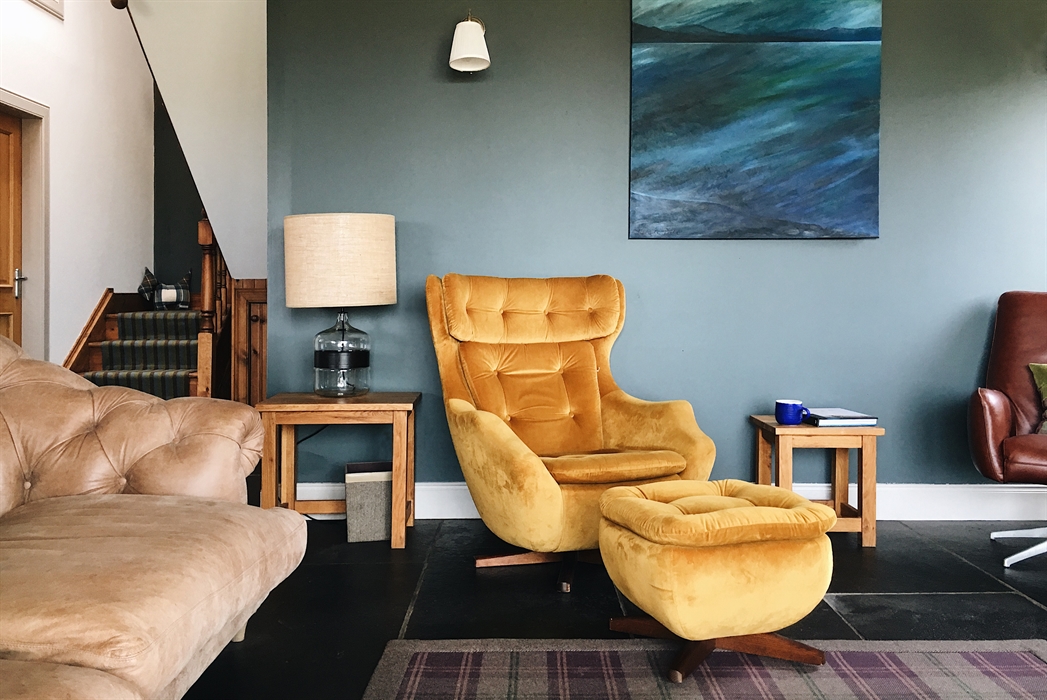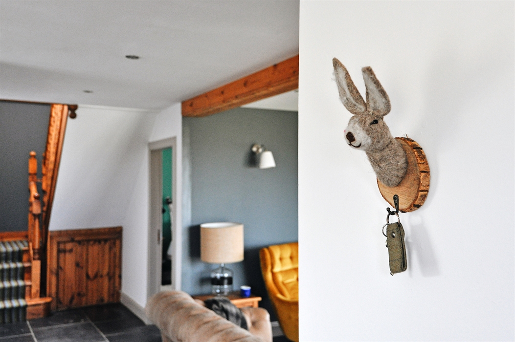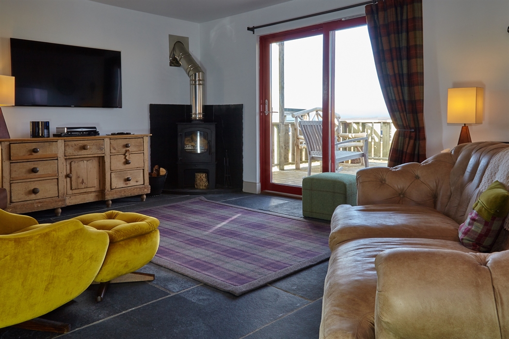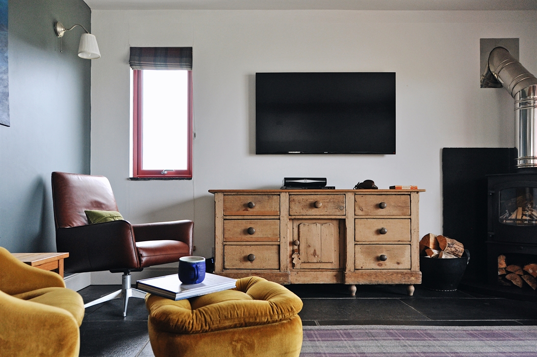 Downstairs the cottage enjoys open plan living creating a very sociable but practical space. Oversized slouchy sofa’s & chairs make relaxing easy. The house is equipped with smart TV, dvd blue ray player, wifi to keep you connected to the outside world – should you wish- there is a Bowers & Wilkins Sound System and fantastic wood burning stove. The kitchen is well equipped with range cooker, super-sized fridge freezer etc There is a wet room with oversized washer and dryer with place to hang wet muddy boots and gear after your adventures of the day. The house is not too big or too small. Ideally suited for couples looking for a romantic escape, friends and family can also join.