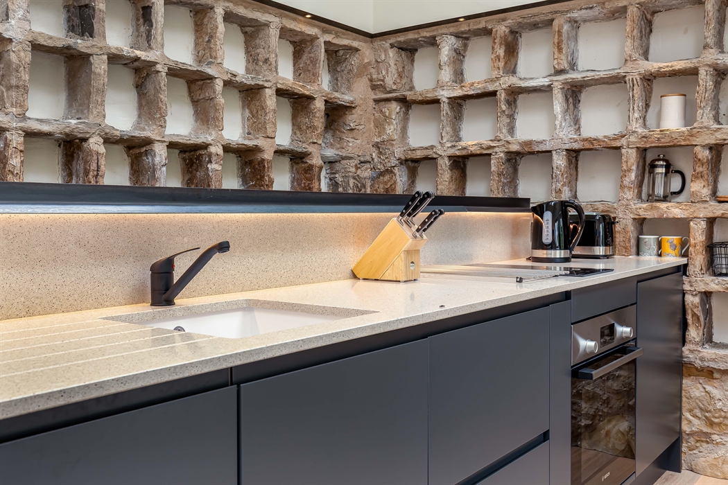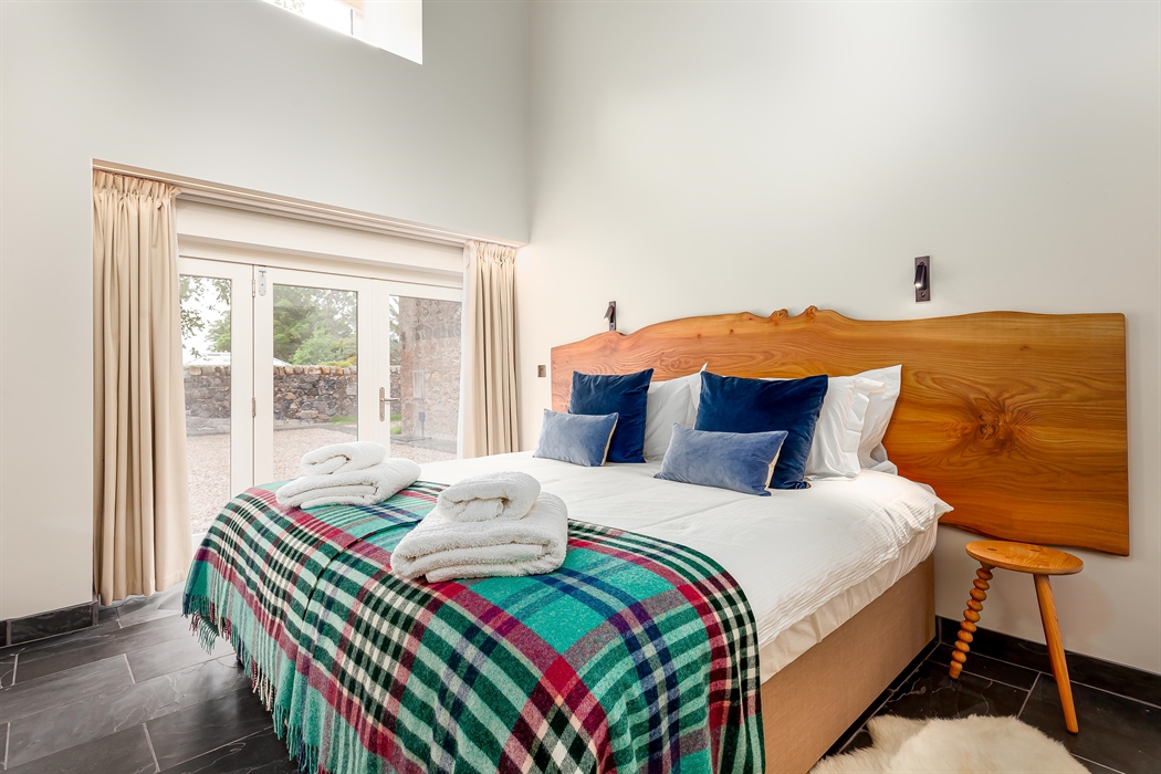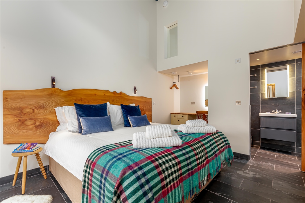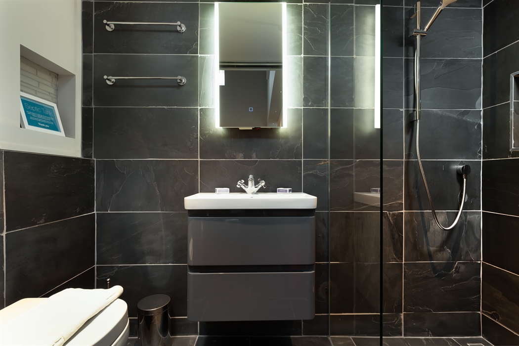 Setting the bedroom apart is a unique ceiling feature - a constellation of twinkling stars which is viewed from the 2 metre long (6 ft, 6.74") superking bed. This bed can be reconfigured into two single beds on request. The slate floor is warmed by underfloor heating and the wet room energised by a high pressure shower.