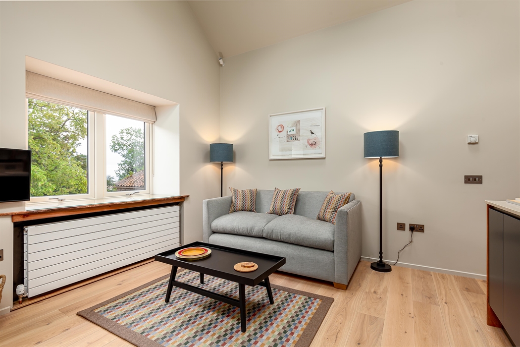 The airy, light filled sitting room makes the most of it's extraordinary structure, perched as it is amongst the tree tops and with far reaching views down to the sea. It's serene colours echo a timeless sense of place as historic features are gently bathed in warm sunlight.