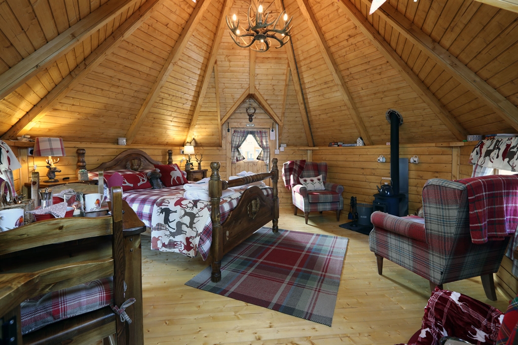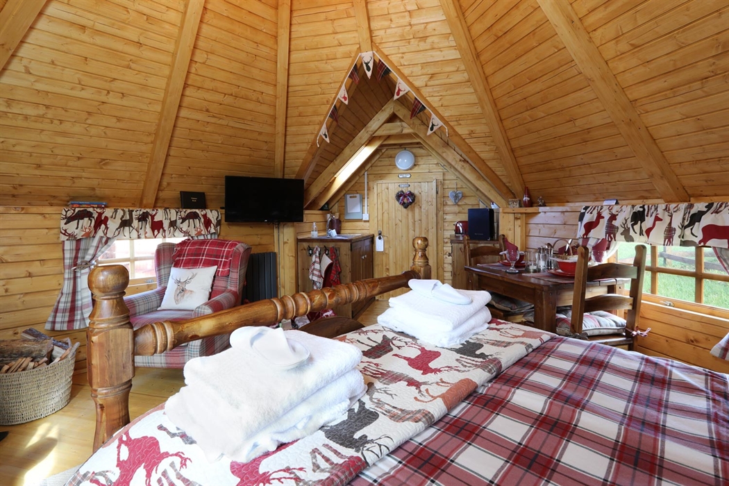 Each lodge is furnished with locally handmade pine furniture, from the large wooden beds with thistle carvings to the dining table and chairs and the kitchen units. The kitchenettes are equipped with a sink, small fridge, microwave, kettle and toaster, and fresh milk, bread, butter, coffee, tea and sugar for your arrival.