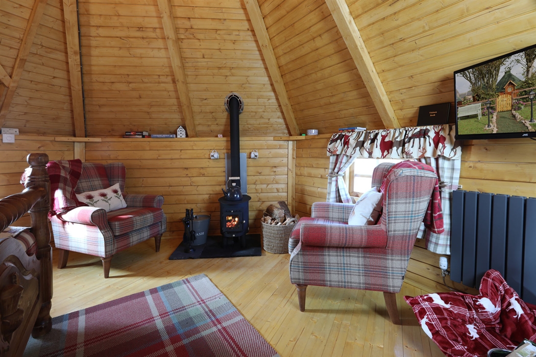 Above the main living areas, high up in the pointed ceiling, hang grand rustic chandeliers. Cosy up on those long dark nights in the comfortable fireside chairs in front of the Hygge wood burning stove. Each lodge has a TV/DVD combi with a good selection of DVDs to choose from.
