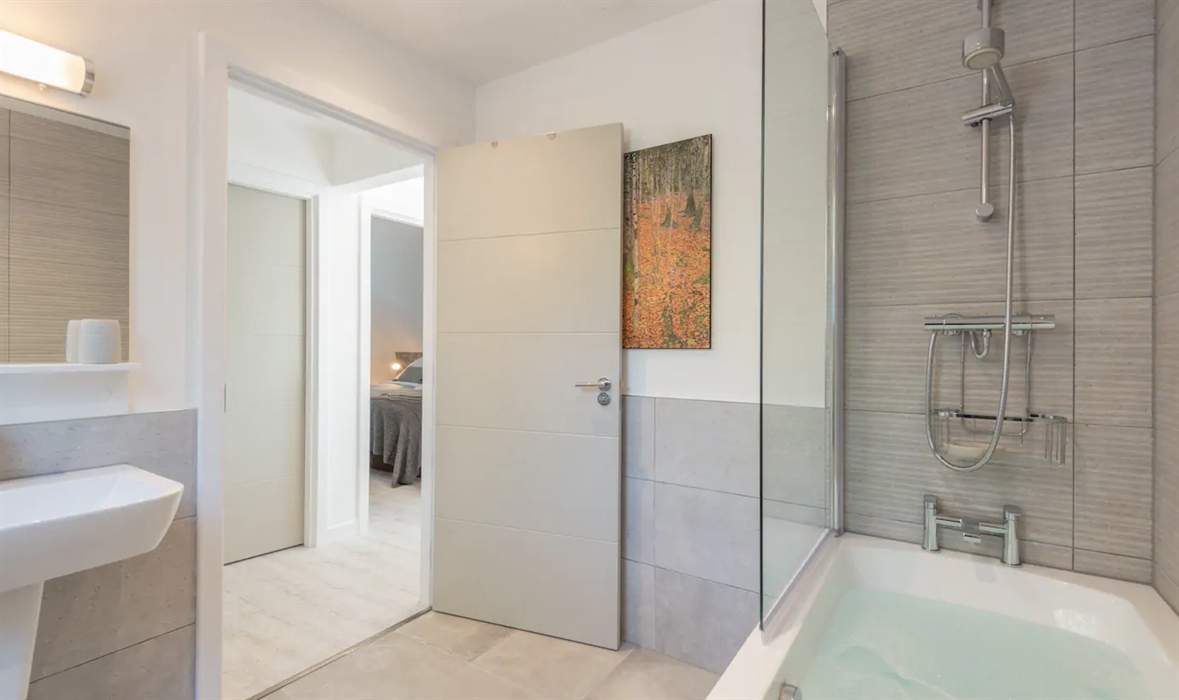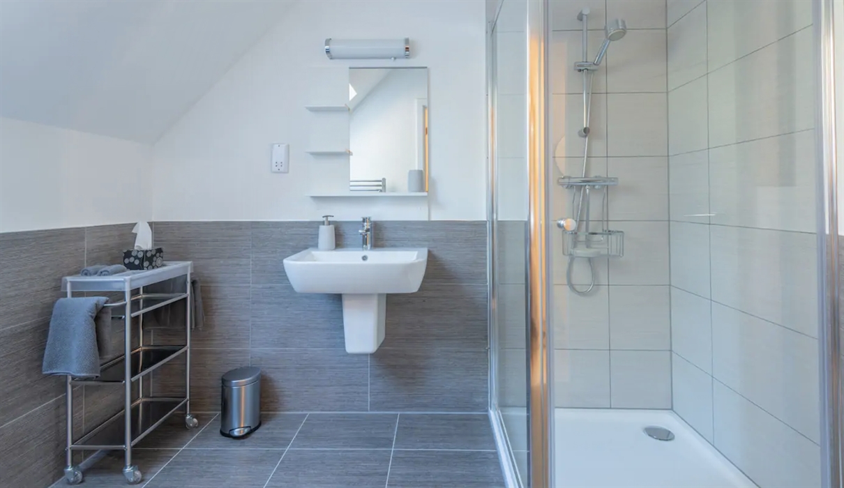 There are four bedrooms, three upstairs and one downstairs. Upstairs, bedroom 1 has a super kingsize bed and an ensuite shower room, and there is ample space for a cot, if requested. Bedroom 2 has a kingsize bed and bedroom 3 has two single beds. Bedrooms 2 and 3 share a family bathroom with a bathtub. Downstairs, bedroom 4 has two single beds, and it has the downstairs shower room. There are grab rails by the WC and in the shower.
