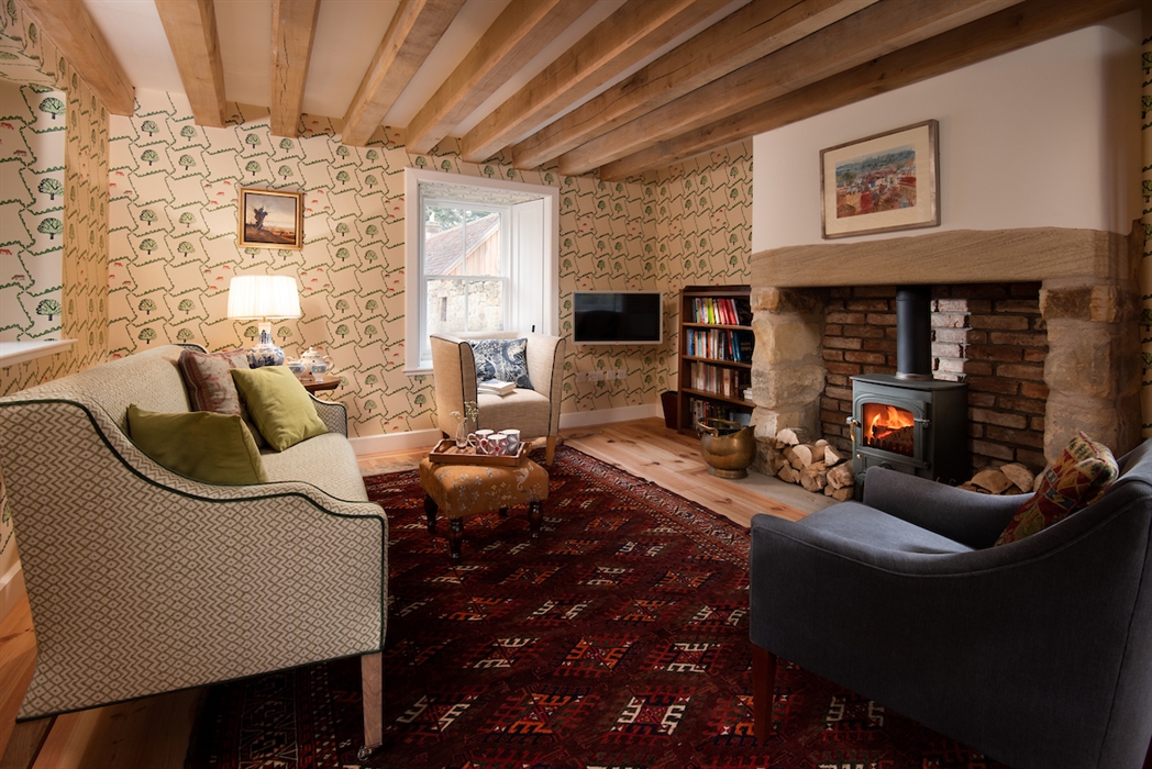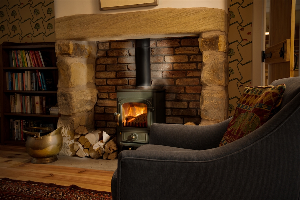 Sitting room with small sofa and two armchairs, wood burning stove, selection of books, wall mounted Smart TV.