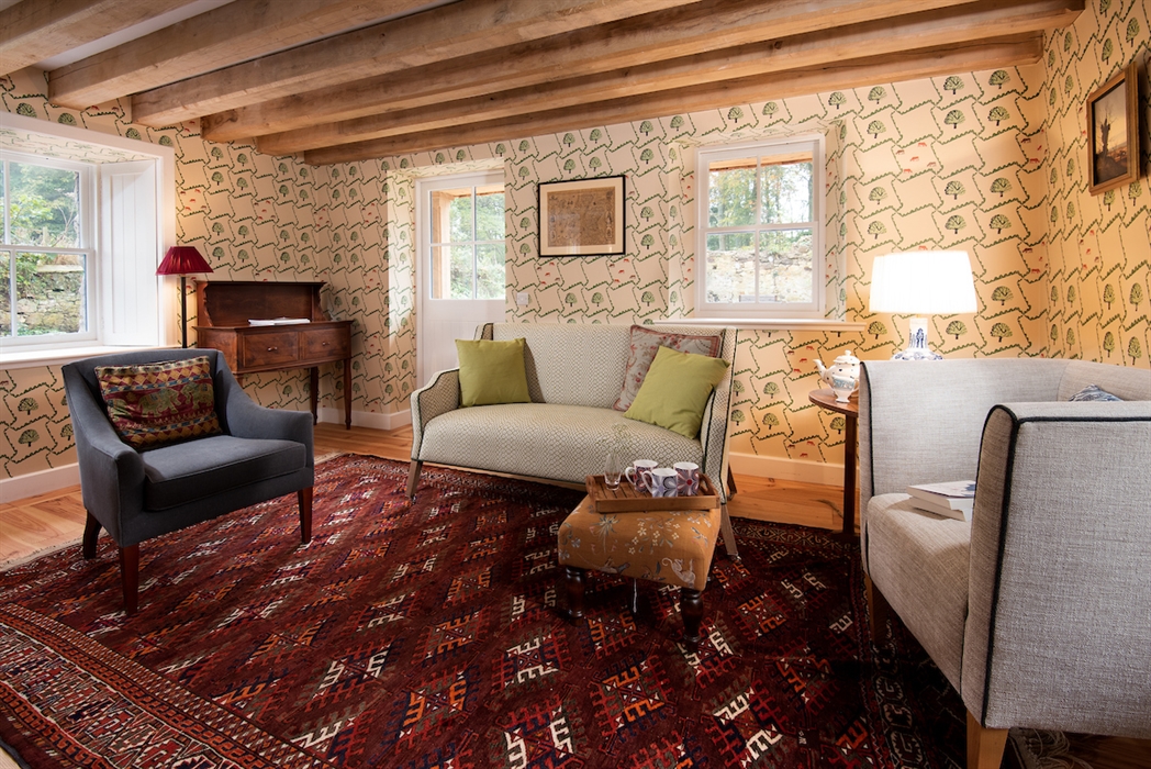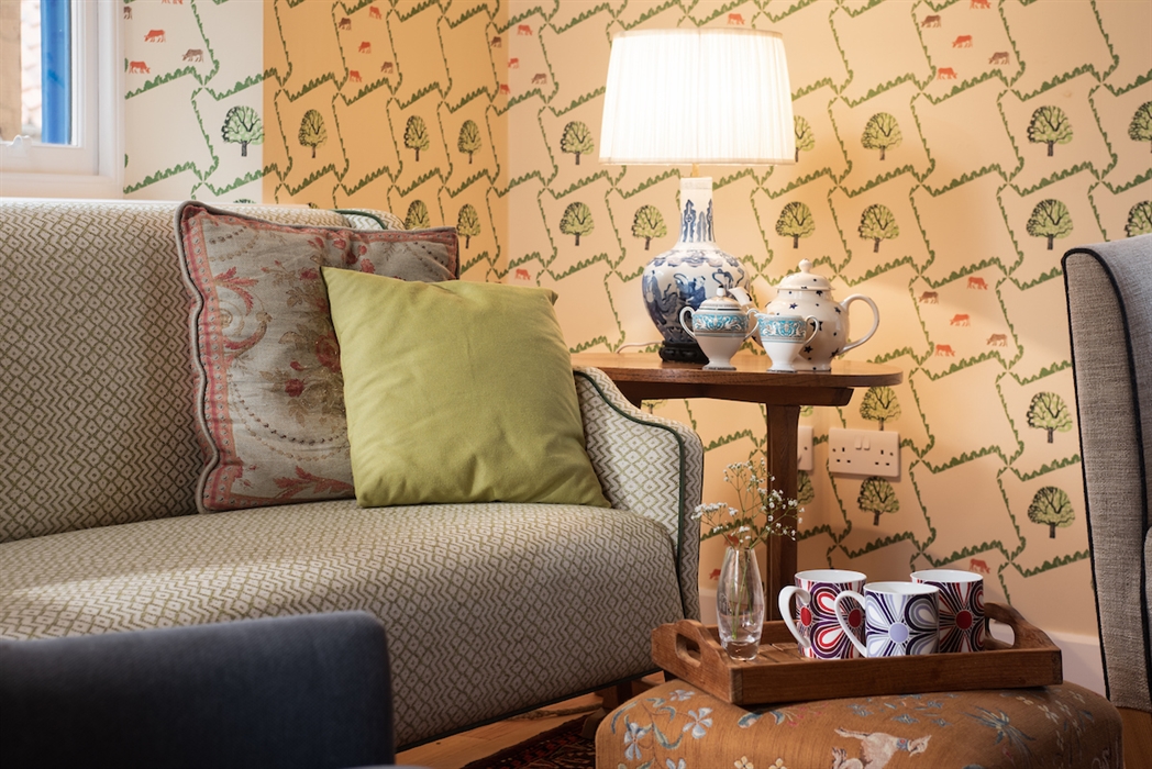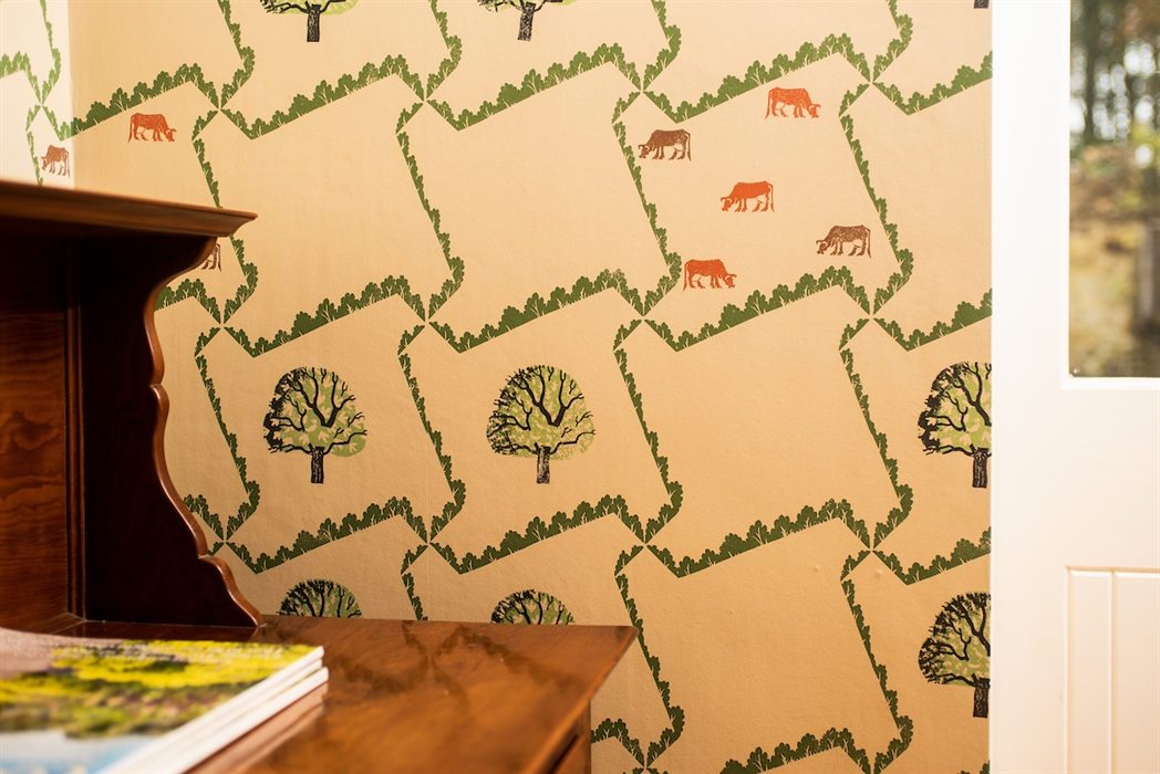 Step inside and the look is quintessentially country with evocative wallpapers such as the 'Tree and Cow', and 'Pigeon and Clocktower' by illustrator Edward Bawden, stunningly reproduced by printmaker St. Jude’s as part of their studio archive range. The overall look is a modern twist on the arts and crafts movement balanced beautifully against the simplicity of furnishings with exceptional styling and design at its core - the Robert 'Mouseman' Thompson bookcase a wonderful example.