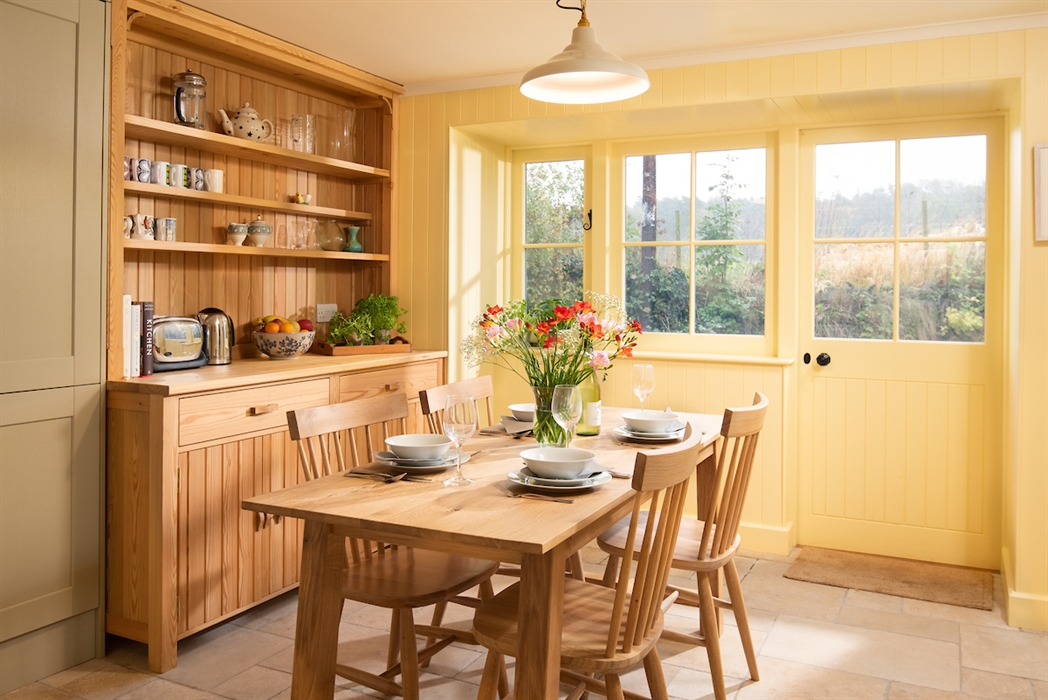 A bright inner hall with desk is a perfect spot when work beckons, leading into an open plan country kitchen which exudes a welcome calm with dining area in sunshine yellow and the craftsmanship showing through the mellow oak finishes. This leads into a ground floor boot room and cloakroom, leading out to a courtyard and a separate games room with ping pong table.
