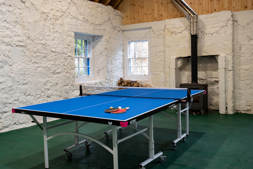Separate barn with games room with ping pong table, wood burner and a darts board.