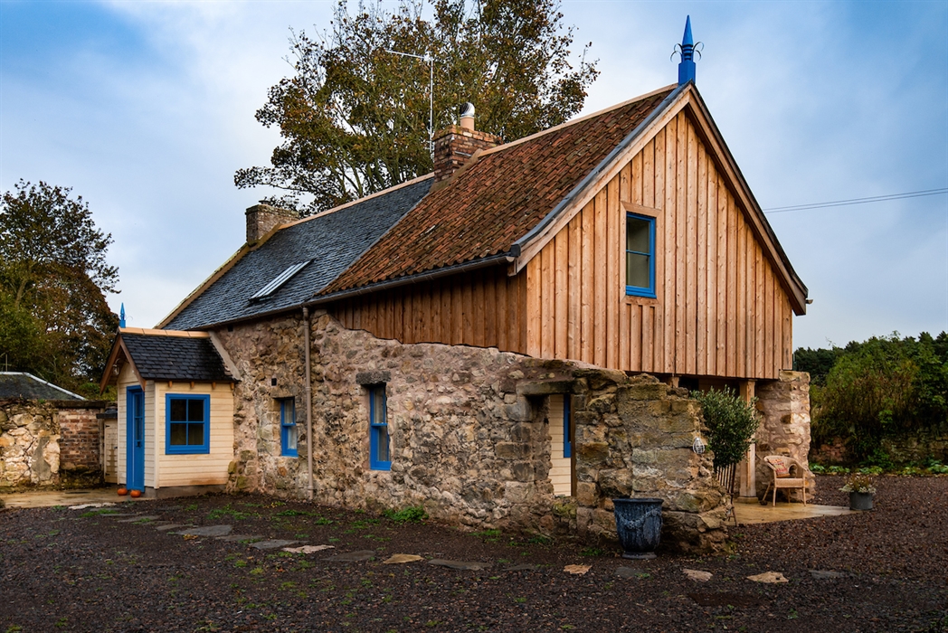 Turn the corner into this steading with its vibrant blue livery and you are drawn by the fantastic combination of rustic wood cladding which reveals the contours of the stonework of the original building.