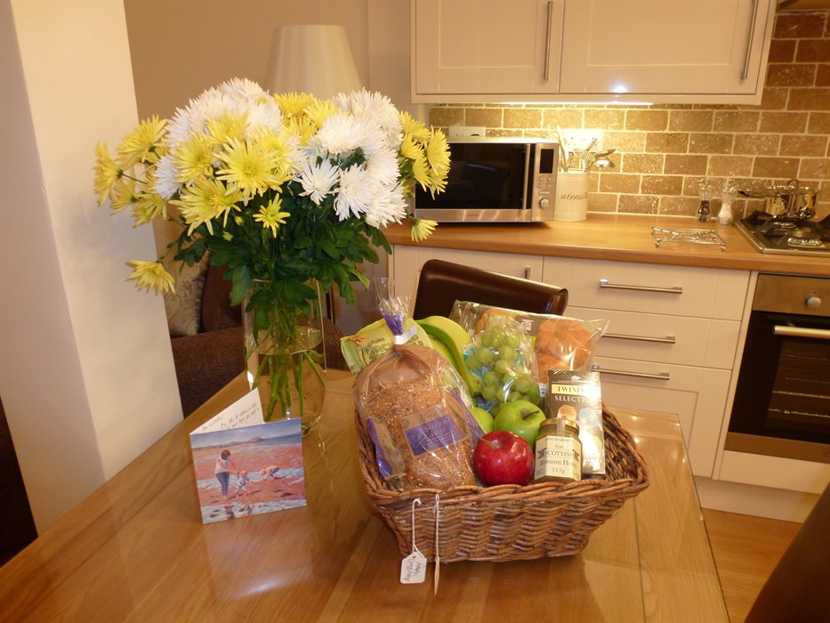 We are delighted to provide fresh flowers and a complimentary welcome basket for each booking containing your first breakfast - fresh bread and butter, milk, fruit juice, jam, cereal, tea, coffee and fruit.
