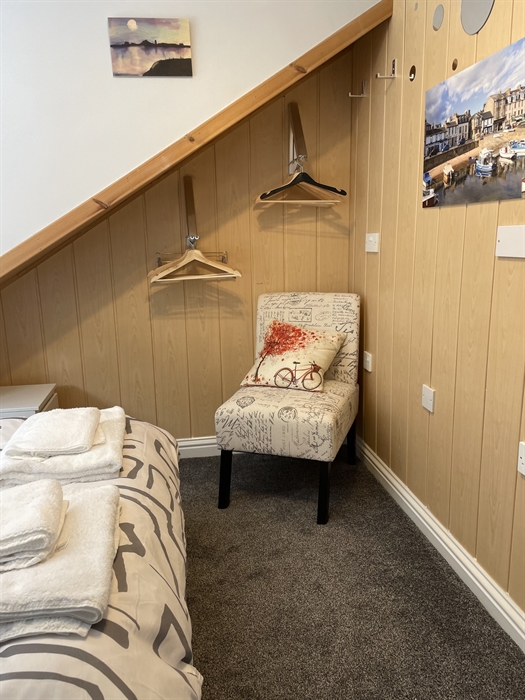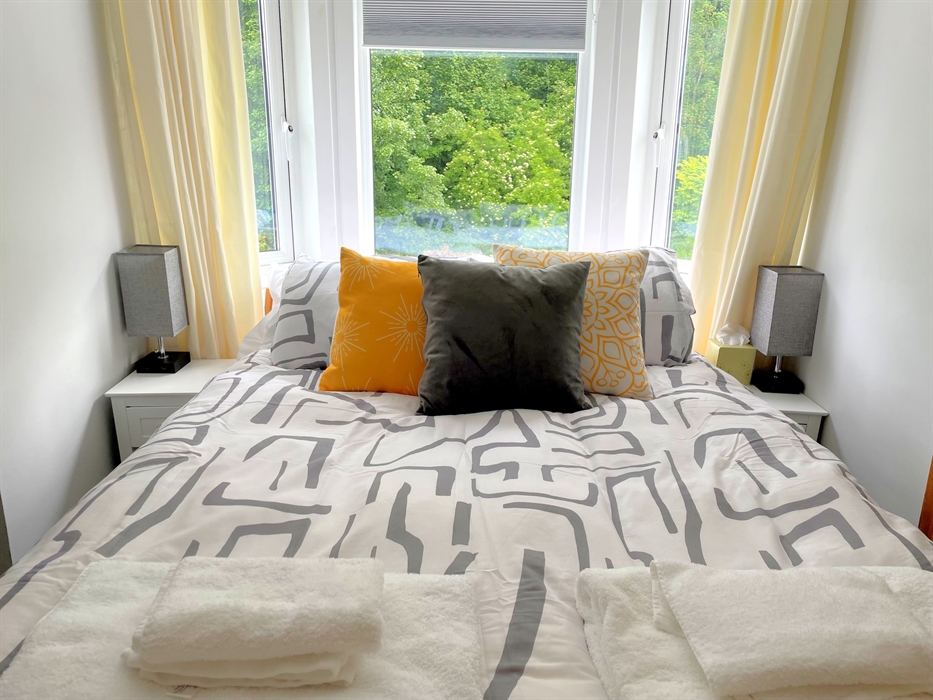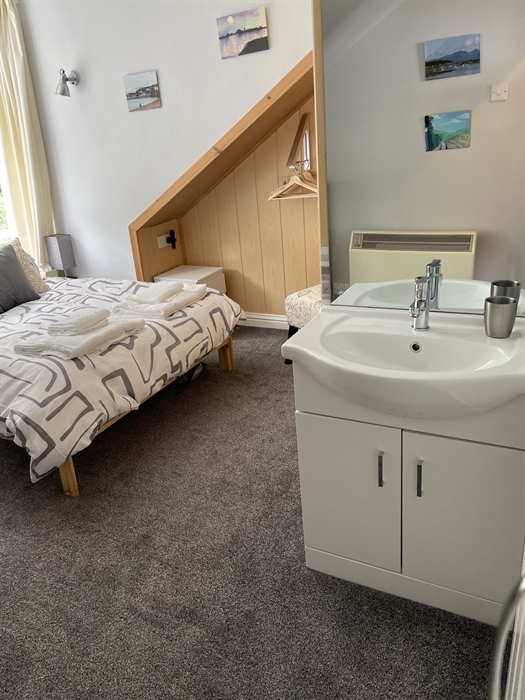 The bedroom has a full sized double bed, underbed storage, hanging space for clothes, chest of drawers, wash hand basin with mirror, bedside tables with lamps that are also USB chargers. Several sockets with USB charging ports are also scattered throughout the property.