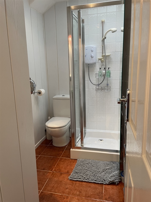 Bathroom with shower, wash hand basin and WC. Toiletries are provided.