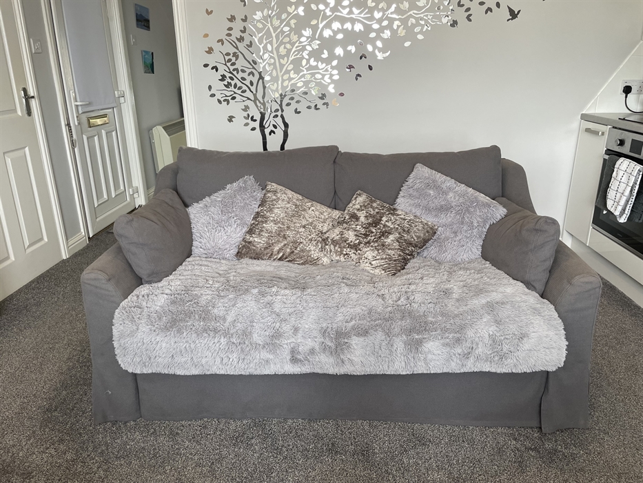 The living room is equipped with a Smart TV with Freesat, and a Netflix subscription. There is seating for 4 people, and a folding dining table is placed at the window so that you can enjoy your breakfast or dinner while enjoying the spectacular sea views. The sofa is also a double bed.