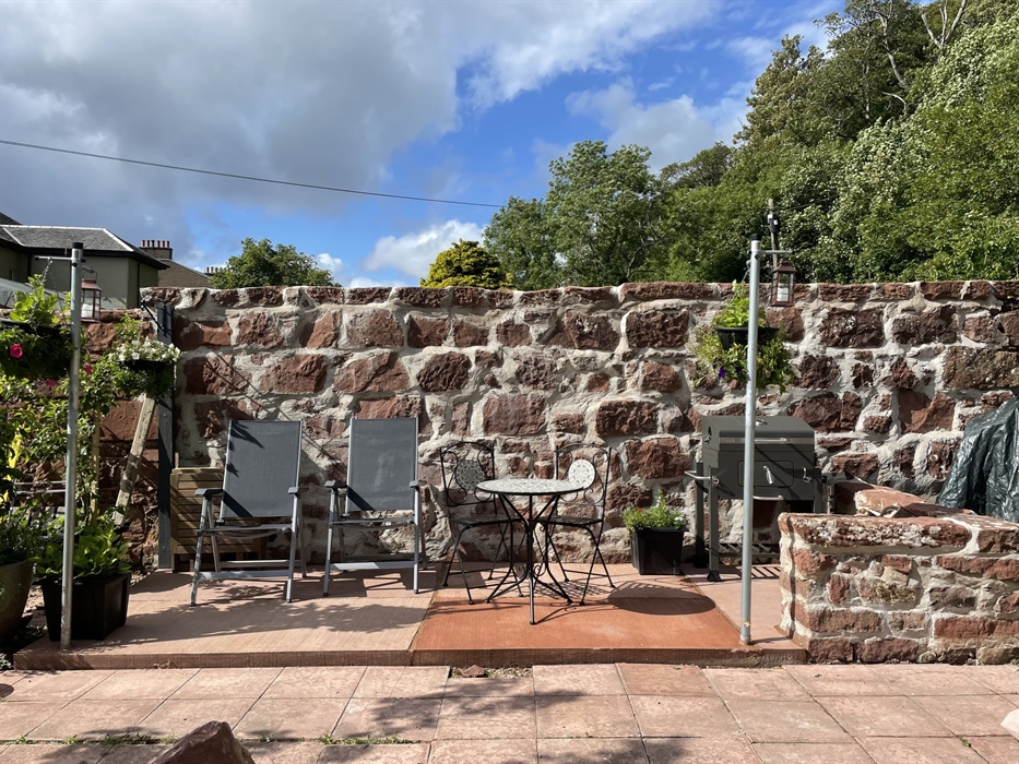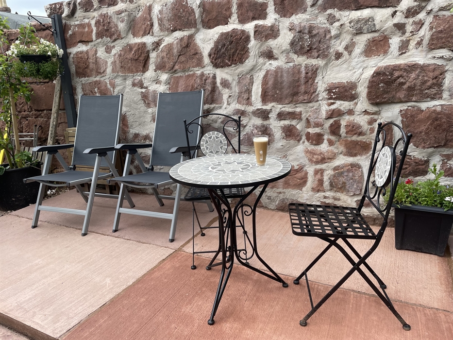 Patio dedicated to guests of the Lookout in the back garden. Patio with dining set, reclining chairs, charcoal BBQ and fire pit.