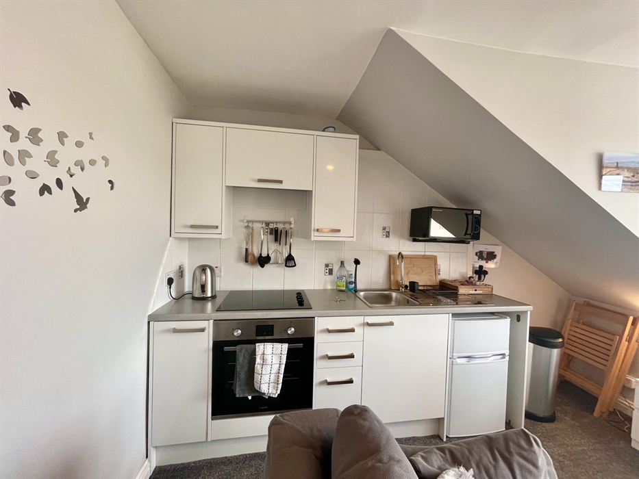 The kitchen area (within the living room) has a hob, oven, microwave, toaster, kettle and small fridge/freezer. All kitchen essentials are provided.