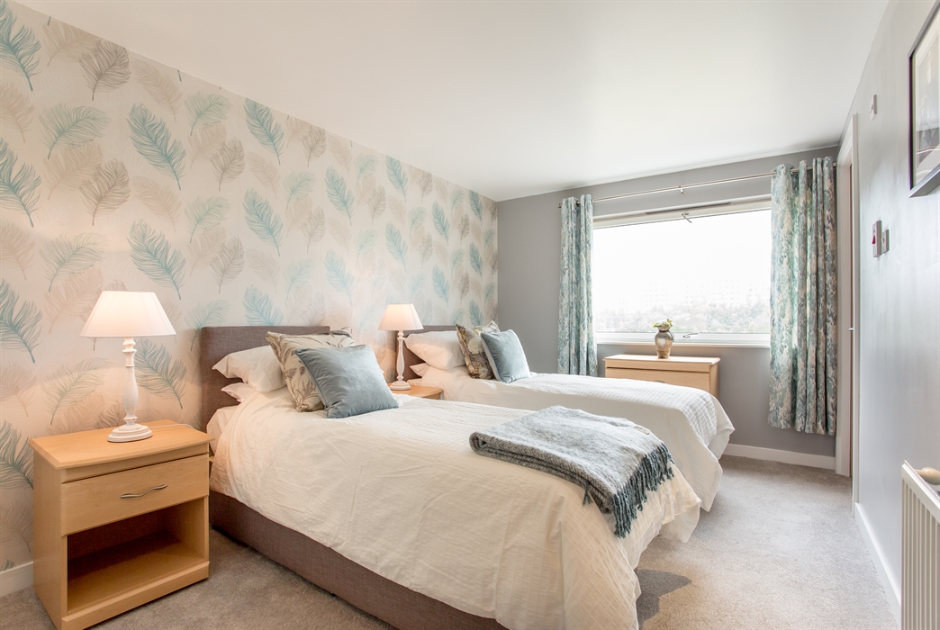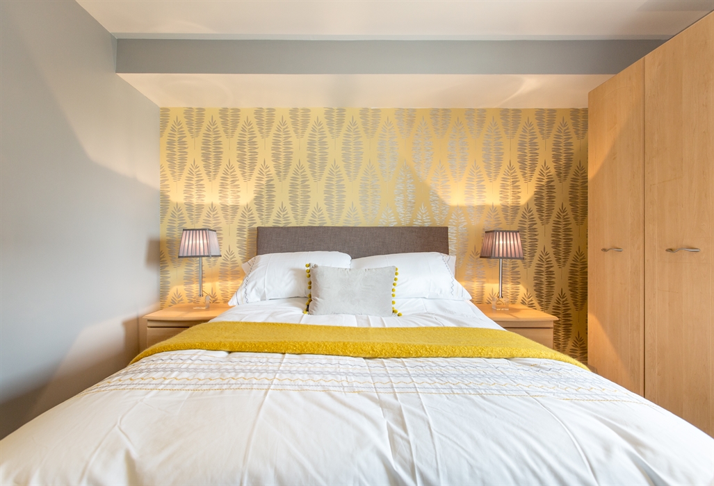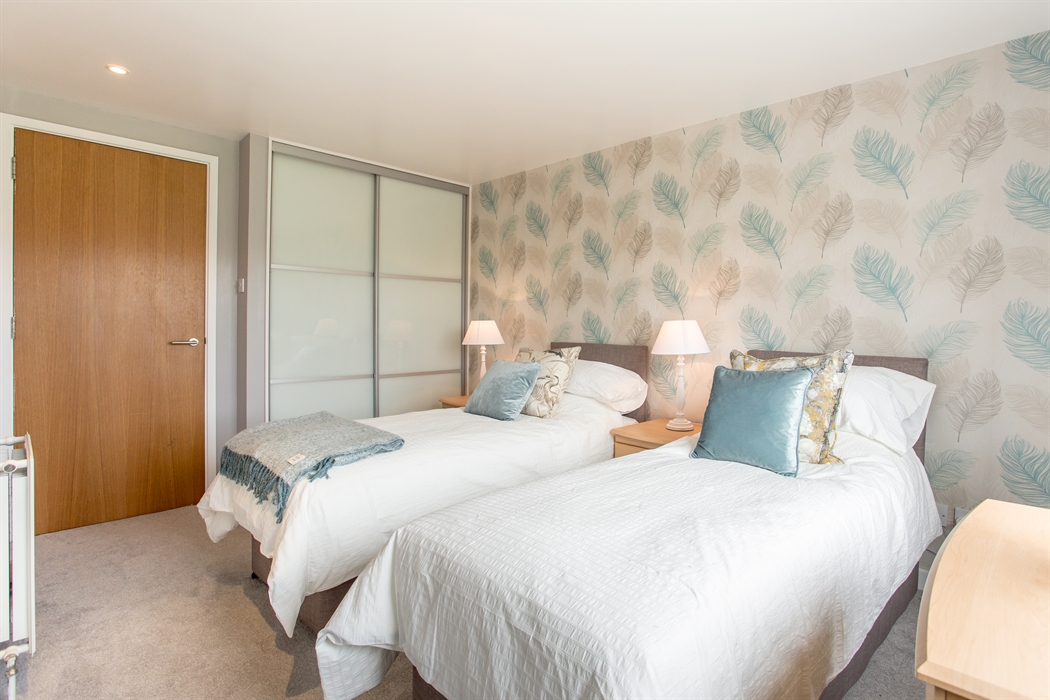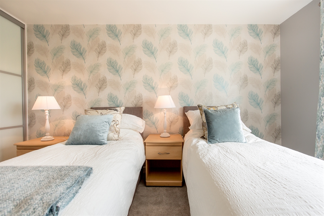 Just down the hallway, the master bedroom is decorated in soothing, contemporary shades, and benefits from an en suite shower room. The bedroom offer flexibility, featuring zip and link beds, allowing either a double or twin bed set up.