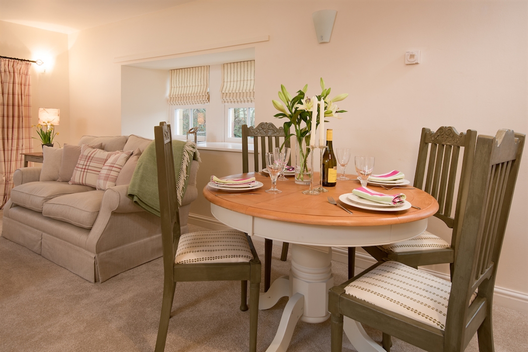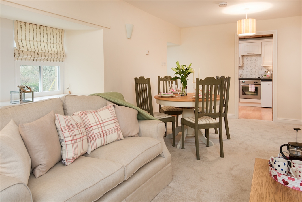 There is a compact but well equipped kitchen with pretty gingham accents and beamed ceiling, while dining for four is provided in the adjoining sitting room.