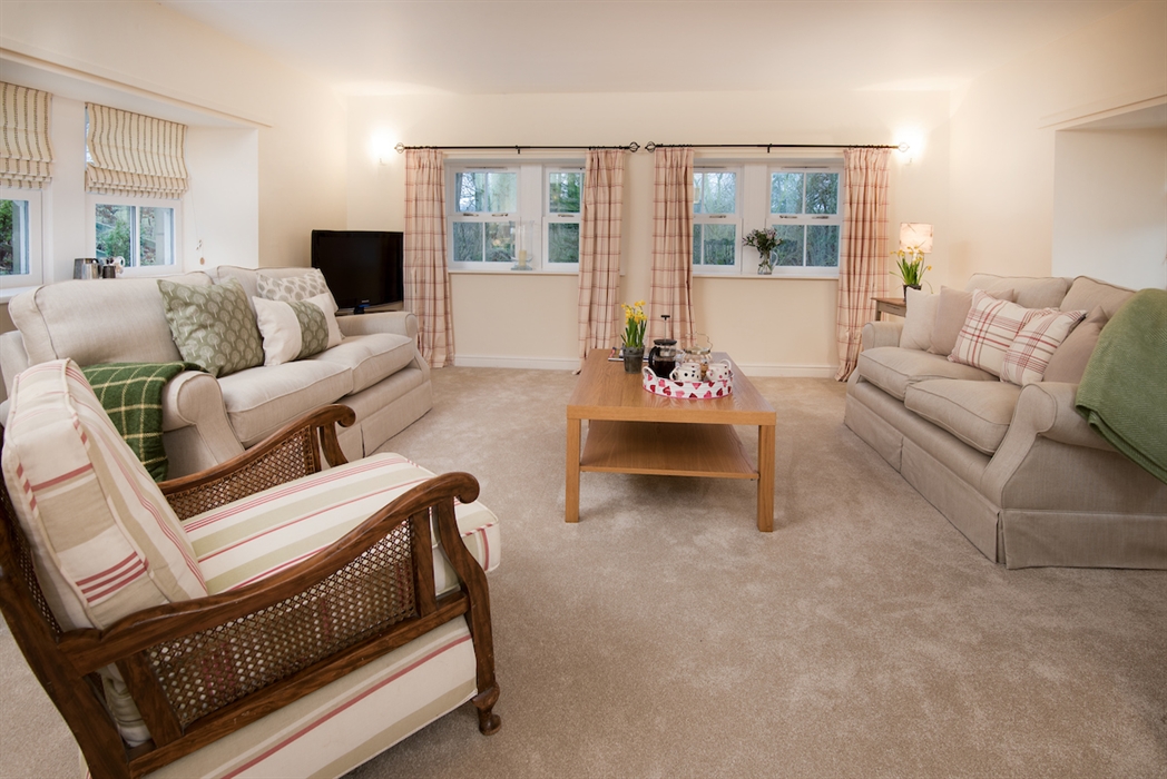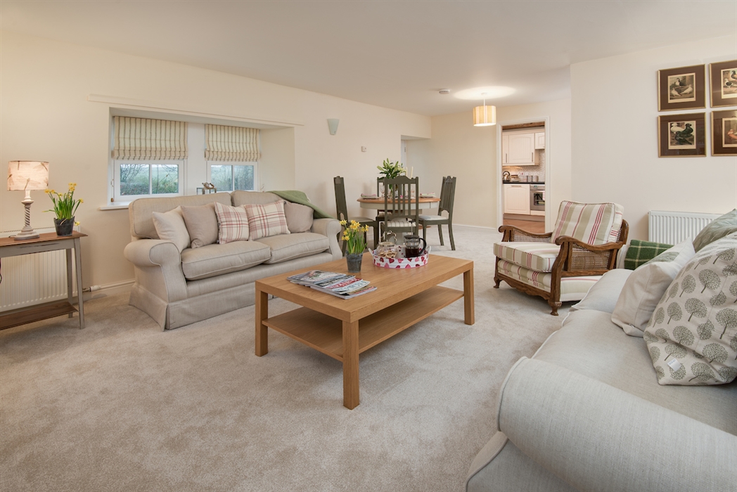 Sitting room with two double sofas and armchair, large flat screen TV and DVD player, dining space with seating for four.