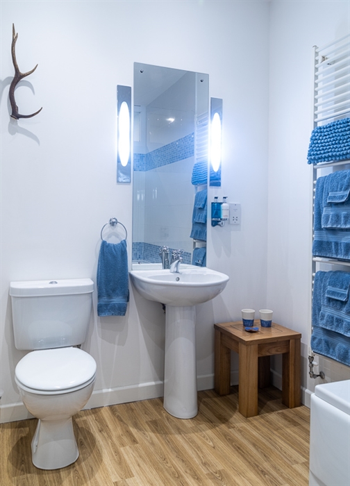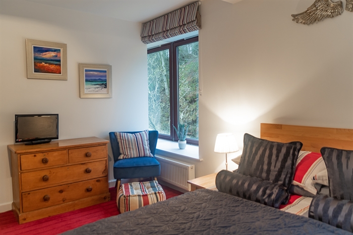 There are four bedrooms, all named after contemporary Scottish artists, two with super king-sized beds that can be converted into twins, and two have ensuite bathrooms; all are furnished for optimum comfort. The Morocco bedroom includes a sofa bed. Bedrooms all have televisions and hairdryers, with 3 of the rooms having views over the river and the other having its own patio with table and seating for 4.
