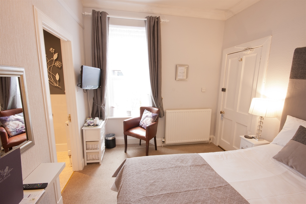 Room 4 is on the first floor with lots of natural light overlooking the front garden. A generous sized room with a very comfortable superking size high quality pocket-sprung bed. It is tastefully decorated with comfortable furnishings. The modern ensuite has a walk-in shower cubicle with shower, hand basin and toilet.There is free wifi access in the room and a beverage tray with a good selection of teas and coffees with biscuits.This room is 15.40m2.