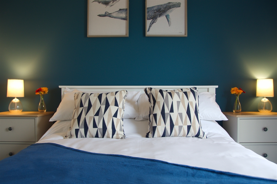 The Blue Room: Unwind in style with a double bed, floor-to-ceiling mirrored wardrobe doors, and a dedicated desk/workspace, providing a perfect retreat after a day of exploration.