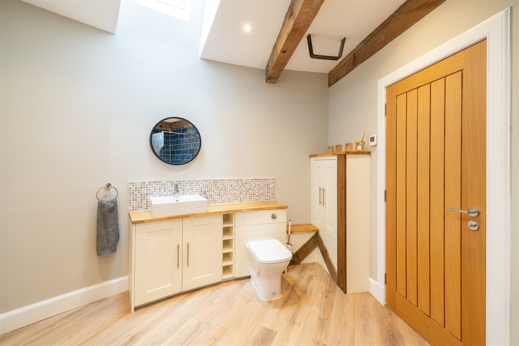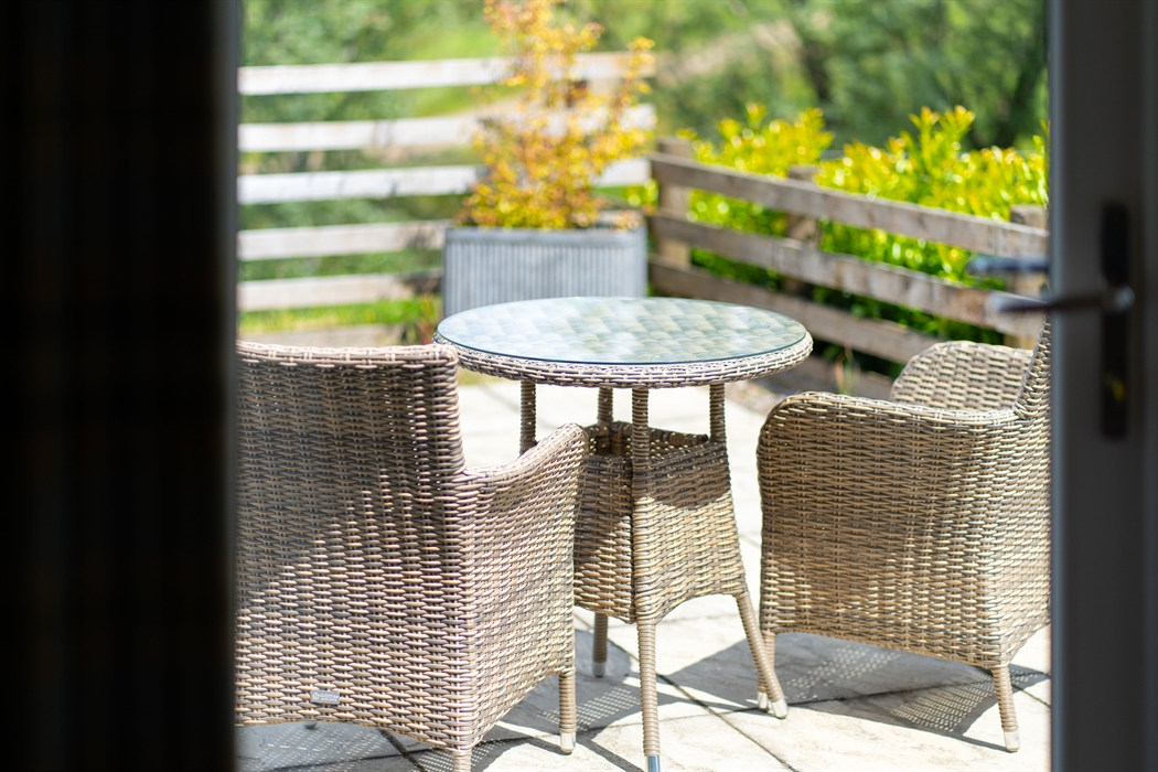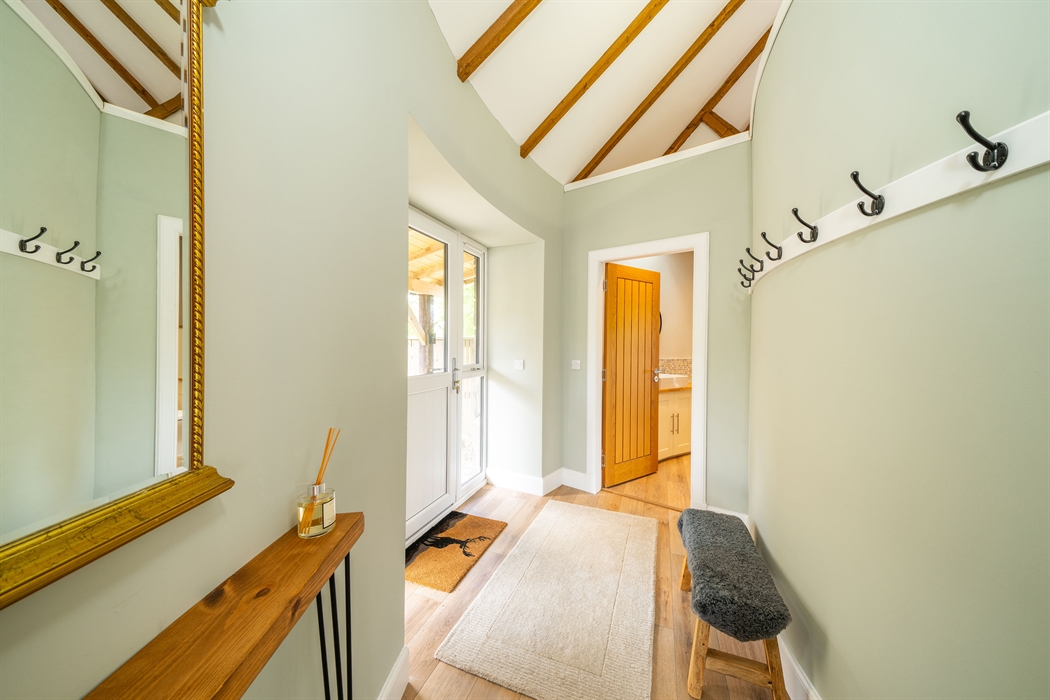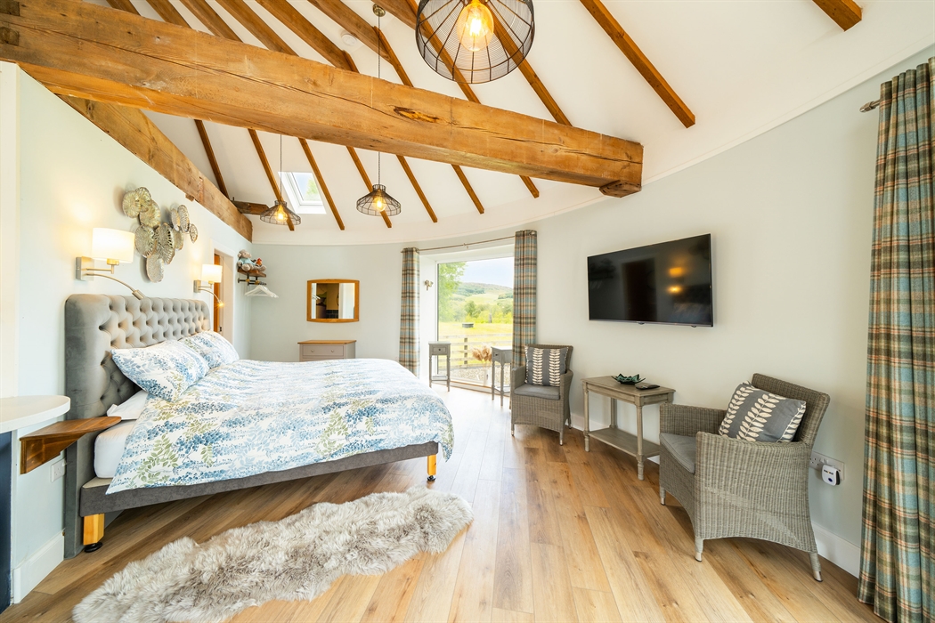 Ground floor: Level access from gravel parking area; Entrance door into Hallway with coat hooks and boot storage; Fully fitted Kitchen area; Dining area; Sitting area with electric stove effect heater and doors leading to patio and garden area; Super King bedroom area leading into a Jack ‘n’ Jill Bathroom (between bedroom and hallway) with large ceramic bath, large walk-in shower, WC and wash basin.