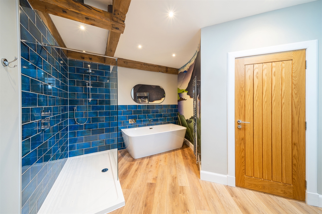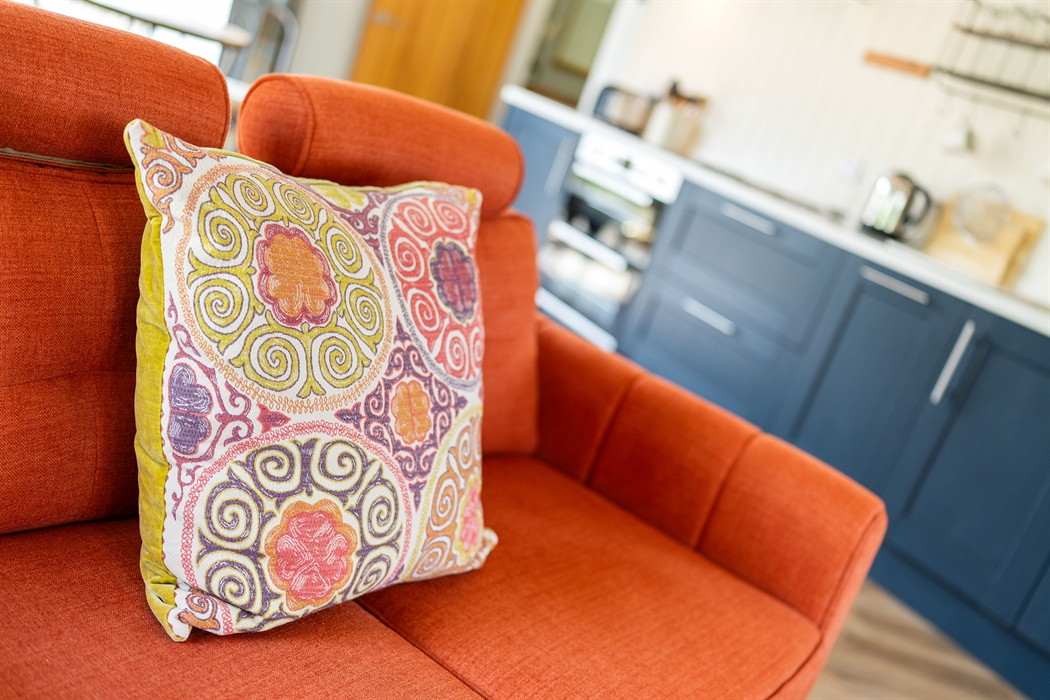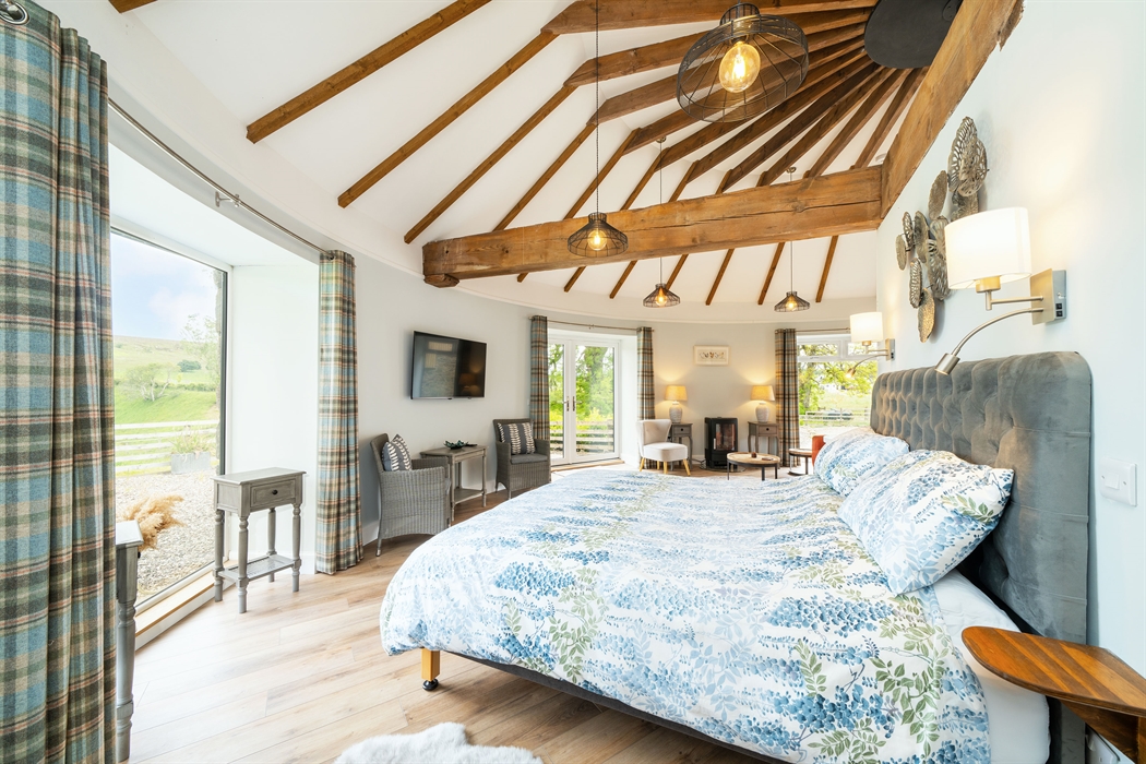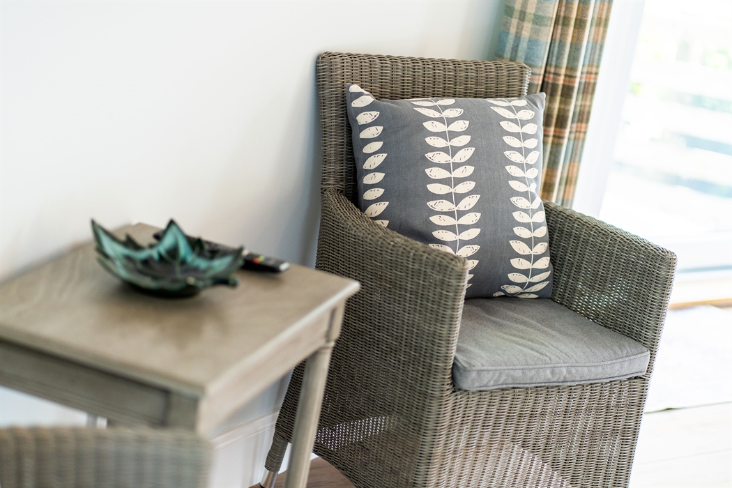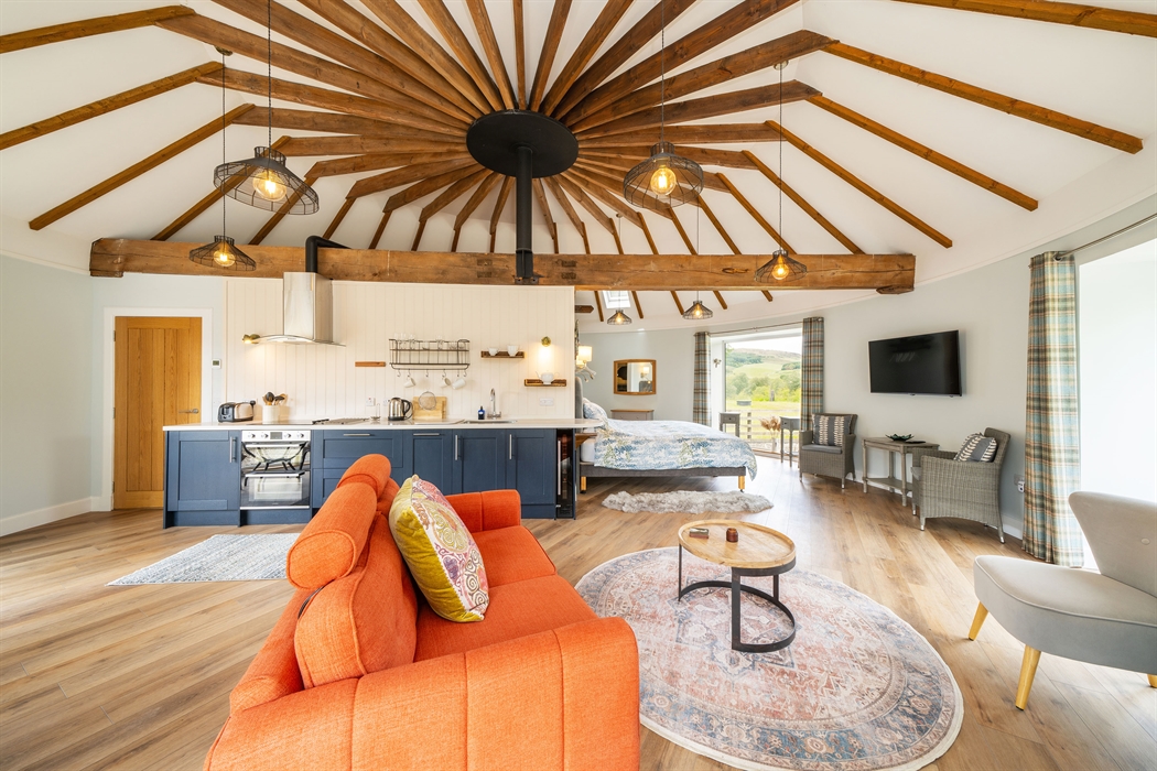 Ground floor: Level access from gravel parking area; Entrance door into Hallway with coat hooks and boot storage; Fully fitted Kitchen area; Dining area; Sitting area with electric stove effect heater and doors leading to patio and garden area; Super King bedroom area leading into a Jack ‘n’ Jill Bathroom (between bedroom and hallway) with large ceramic bath, large walk-in shower, WC and wash basin.