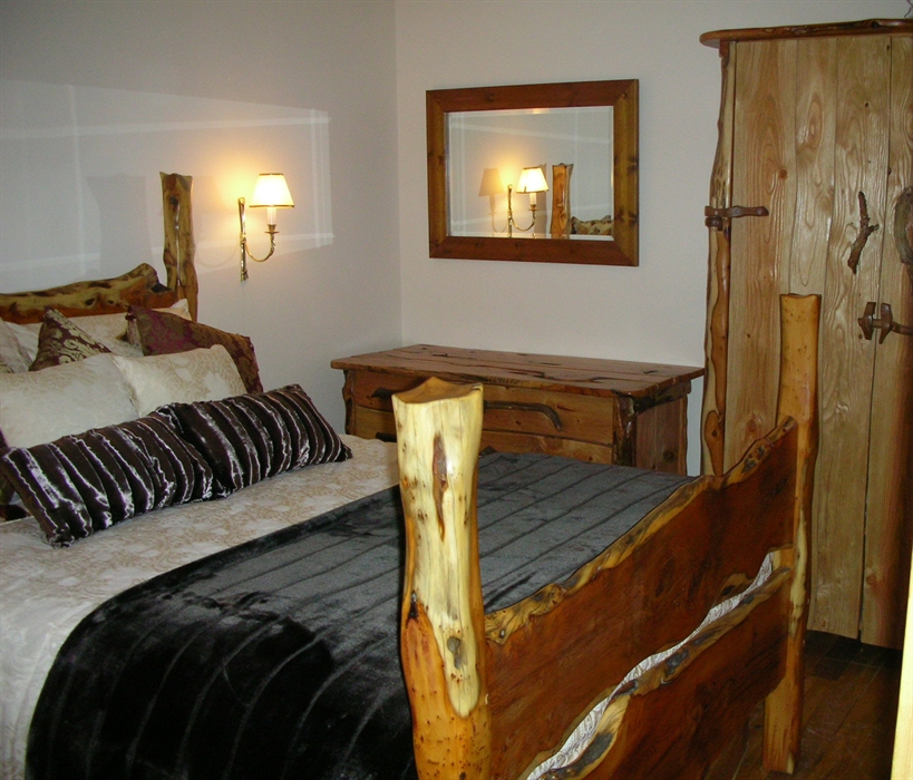 The Shieling bedroom is floored with elegant hand cut elm wood and uniquely furnished with a classic rustic hand made double bed, luxurious mattress, wardrobe and chest of drawers.