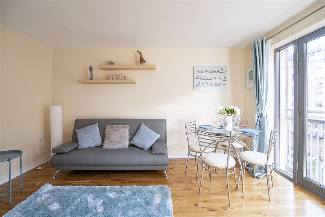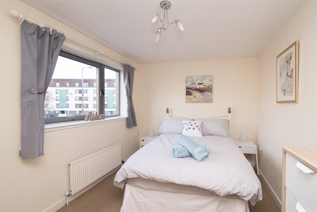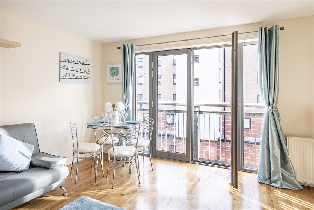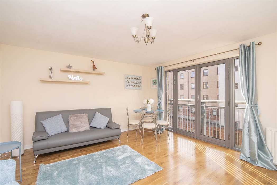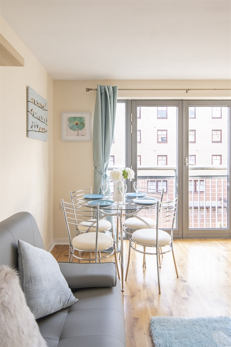 Situated across from landscaped public gardens and nestled between Glasgow Green and the Merchant City the flat offers a convenient location for all the major attractions Glasgow has to offer. As Glasgow’s oldest park, Glasgow Green is a fantastic outdoor space to explore and features the Peoples Palace, Nelsons Monument and the Templeton Factory. The flat is 8 minutes drive from the Celtic football ground and the Emirates Arena and 12 minutes drive from the Tollcross international swimming centre. Heading west, Glasgow Cross and the famous Tron are less than a minute’s walk way away and this leads onto the city centre. Turning north will take you to the vibrant Merchant City which is packed with stunning architecture, high end shopping, top class restaurants, bustling trendy night life, thriving art scene and an outstanding cafe culture. The flat is also only a 10 minute walk from Strathclyde University, a 5 minute walk to the Barrowlands / St Luke’s and a 10 minute drive from SECC/The Hydro. The spacious lounge is very bright and has double doors opening to a Parisian Balcony. In addition to comfortable sofa and two arm chairs there is a glass dining table with four chairs. The flat has a double bedroom with plenty of storage and the bathroom features a high pressure shower. The second bed is a self inflating aerobed. The stylish kitchen is equipped to the highest standard with everything you could need to prepare a meal. The flat is equipped with superfast fast wifi (65Mbs) and a TV with Freeview channels, free Netflix and on demand apps such as BBC iPlayer. We provide tea, coffee and other essentials such as salt & pepper and olive oil to make your stay more comfortable. Hotel standard cotton bed linen and towels are provided for all guests. We can also provide a travel cot and high chair for a small charge. For your safety there are interconnected smoke alarms and a heat detector, a carbon monoxide detector a fire extinguisher and a First Aid kit. If travelling by car the flat can be easily reached from the M8, M74 and M77 motorways otherwise Argyle Street Train station is an 8 minute walk away, Queen Street station a 10 minute walk and Buchanan Street Bus station is a 15 minute walk away. Please note there is also a taxi rank located across the road.